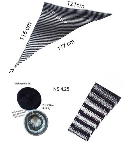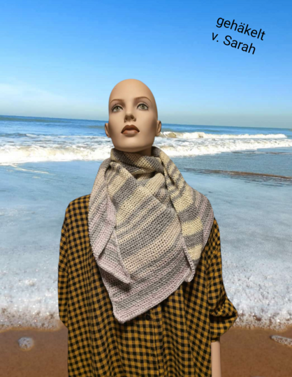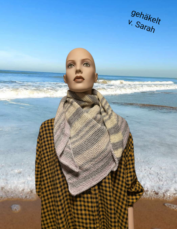 Das Tuch auf dem Titelbild wurden mit 2 x 500 m, 4-fädigen Farbverlaufsgarnen (Baumwolle Polyester Gemisch) mit Häkelnadelstärke 4 locker gehäkelt.