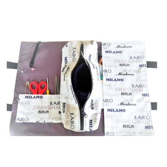 Diese Tasche bietet Stauraum für ein kleines aktuelles Strickobjekt in einer praktischen Tasche, sowie Fächer für die Handarbeitsutensilien. Ein Seitenfach für die Strickanleitungen ist auch vorhanden. Tragegriff für ein schnelles mitnehmen.