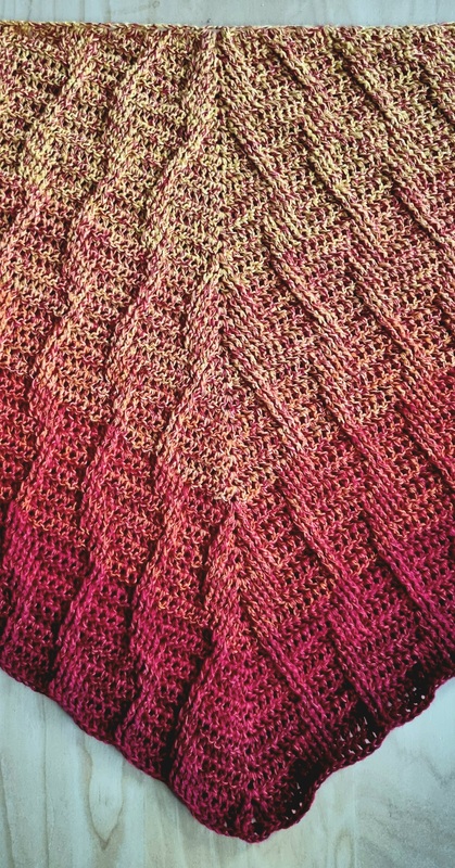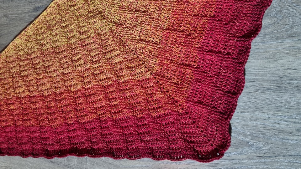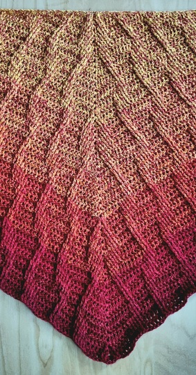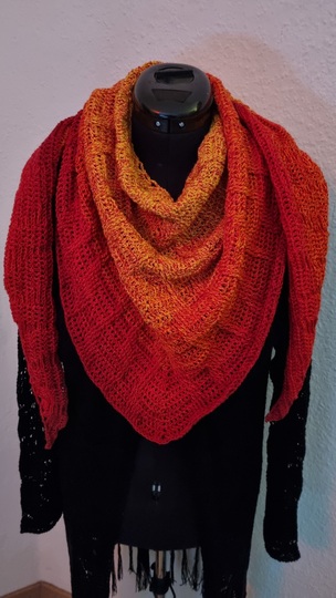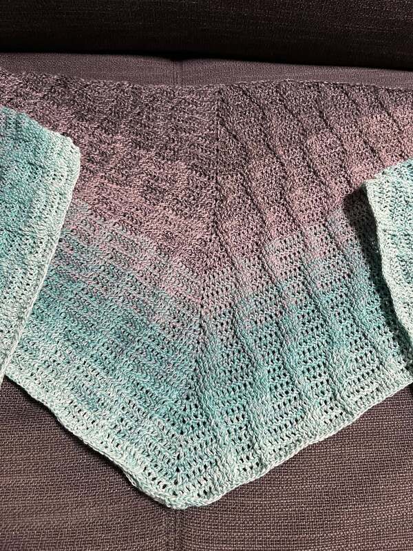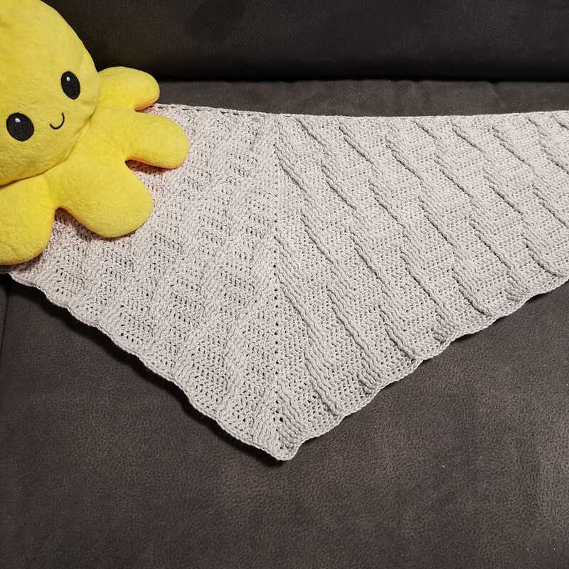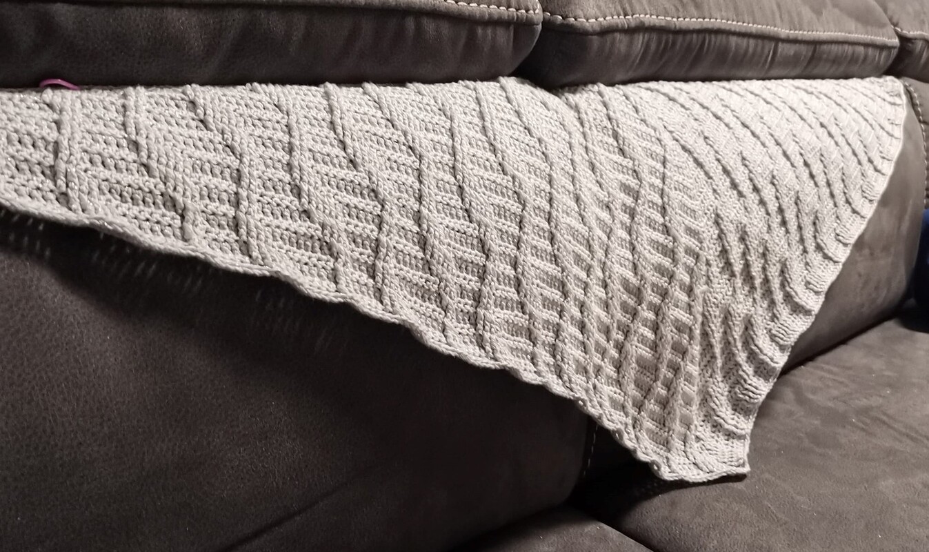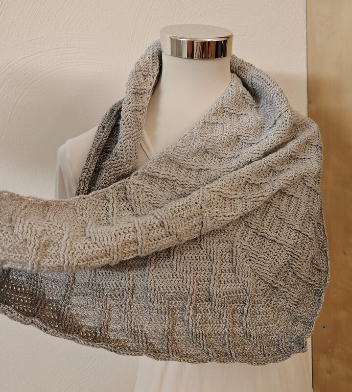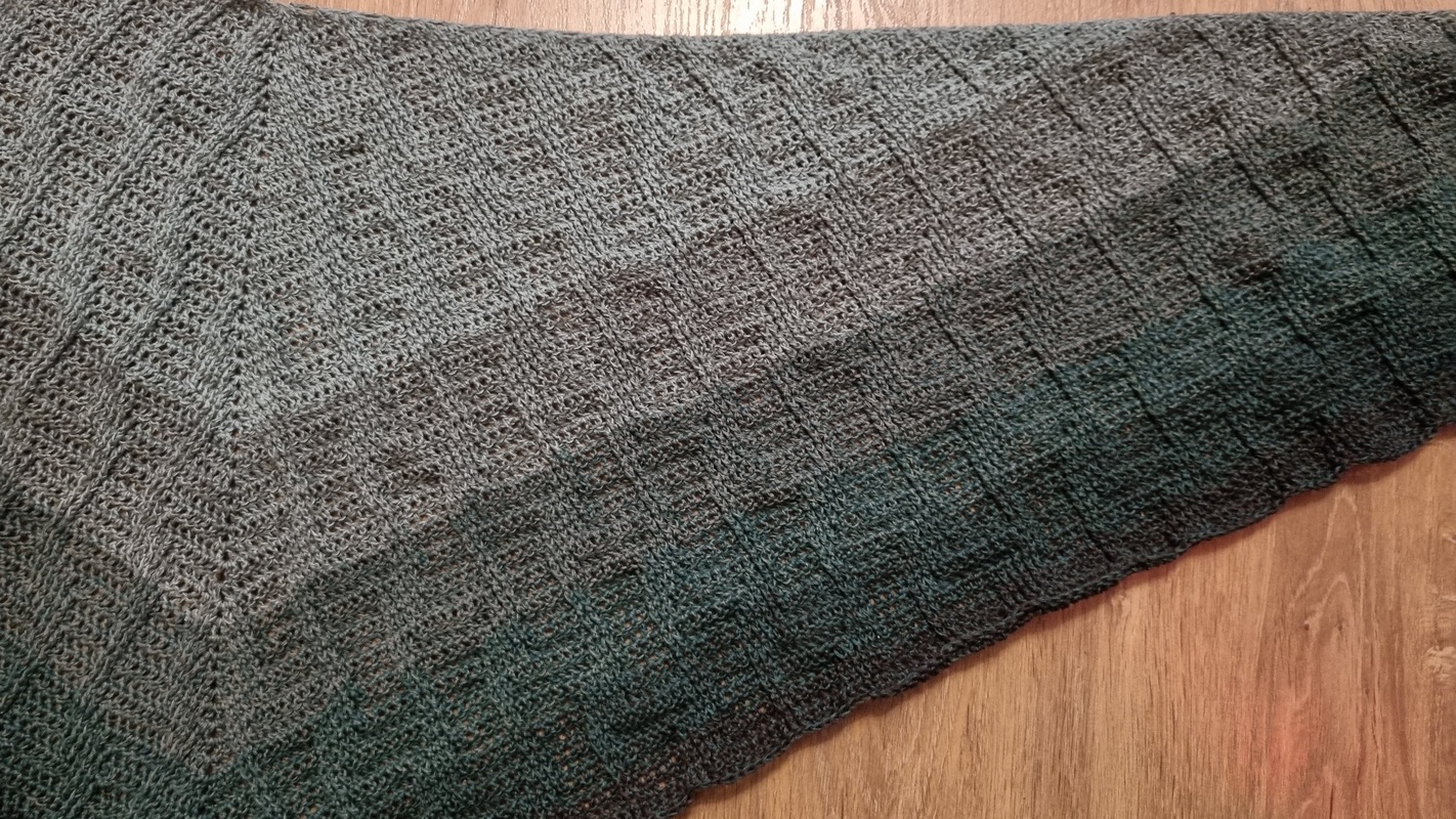 Es ist ein flaches, symmetrisches Tuch, das beliebig groß gehäkelt werden kann. Durch den Wechsel aus Stäbchen und Reliefmaschen ergibt sich ein beschwingtes Muster. Es ist symmetrisch.