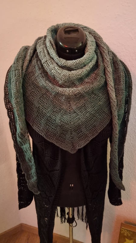 3- oder 4-fädiges Farbverlaufsgarn mit einer Lauflänge von 1000 m - 1200 m. Ein Tuch in Kindergröße kommt mit einer Lauflänge von 800 m aus.