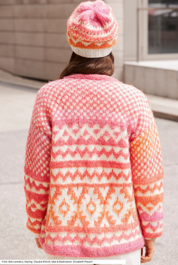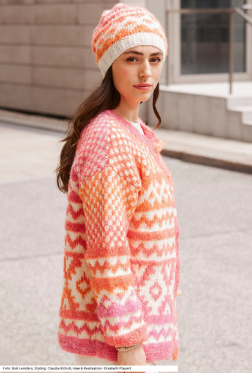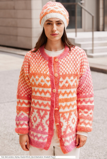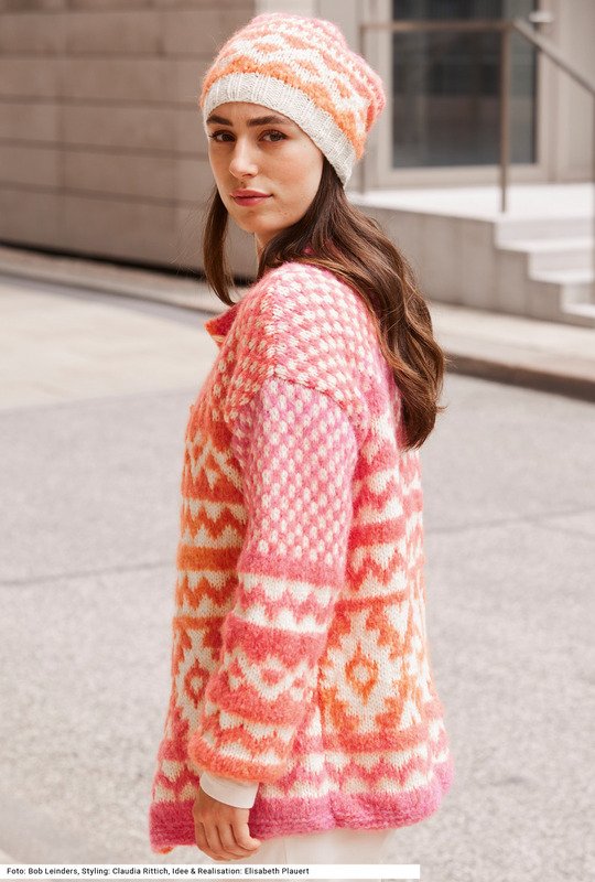Dieses Mustermix-Duo aus Jacke und Mütze ist ein idealer Kombipartner. Dafür sorgen die weiß und himbeerfarbenen Jacquardmuster aus zwei Qualitäten: Das weiße Garn aus Schurwolle mit Kaschmir- und Polyamid-Anteil sorgt für einen hohen Kuschelfaktor, das himbeer-aprikotfarbene Verlaufsgarn aus Alpaka und Polyamid bringt denn herrlich leuchtenden Farbeffekt mit, der die unterschiedlichen Jacquardmuster perfekt in Szene setzt. Gestrickt wird glatt rechts, die Bündchen und Knopfblenden im Rippenmuster. Eine Anleitung kann für die Größen 36/38, 40/42 und 44/46, Mütze: 55 – 57 cm Kopfumfang downgeloadet werden.