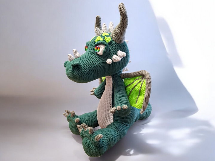 Der Fertige Drache wird ca. 46cm hoch. Natürlich kann die Größe variieren, je nachdem ob man fest oder locker häkelt. Auch die Wahl der Wolle ist entscheidend. Ich selbst häkle mit Baumwollgarn 125m/50g (100% Baumwolle).
