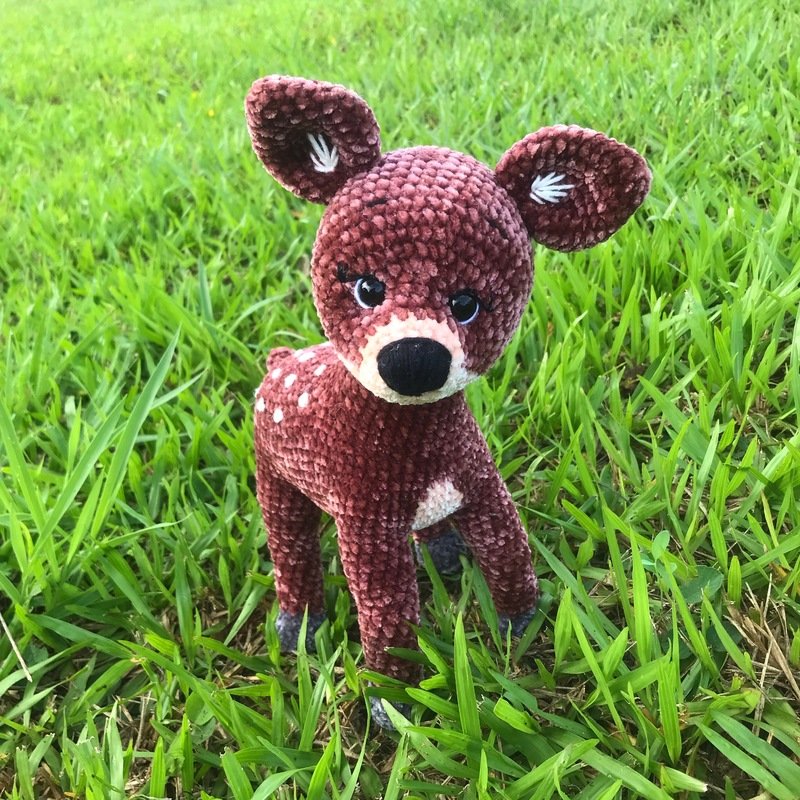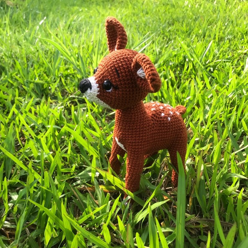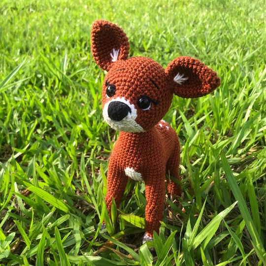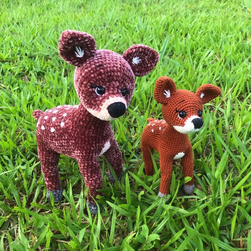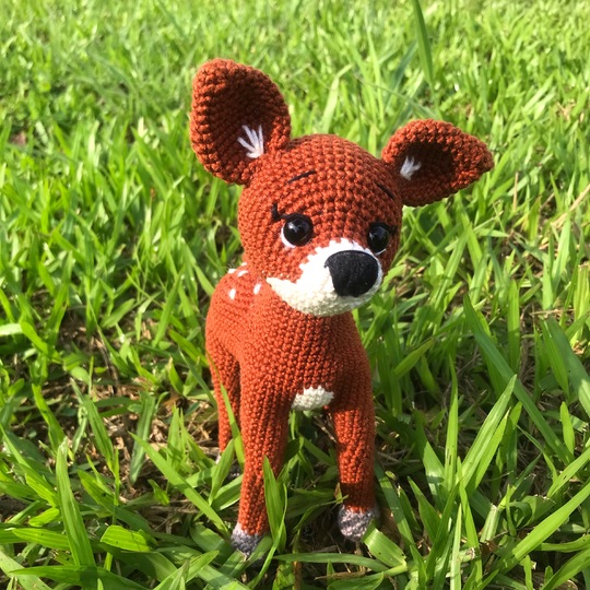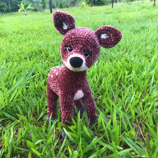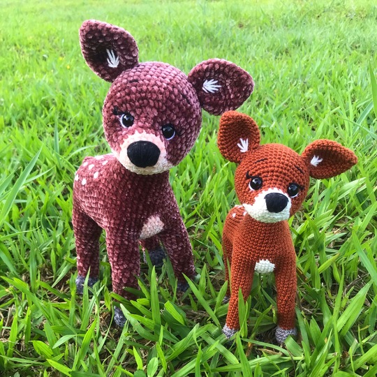 Die Größe von Lea ist von den Materialien, die du verwendest und deiner Häkelweise abhängig. Ich habe bei der Anleitung ein feines Chenille Garn verwendet und mit X-Maschen gehäkelt. Das Rehkitz ist etwa 26 cm groß.