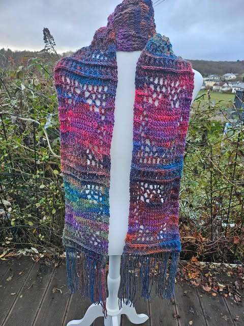 Mit dem angegebenem Material wurde mein Schal 160 cm lang (ohne Fransen) und 22 cm breit.