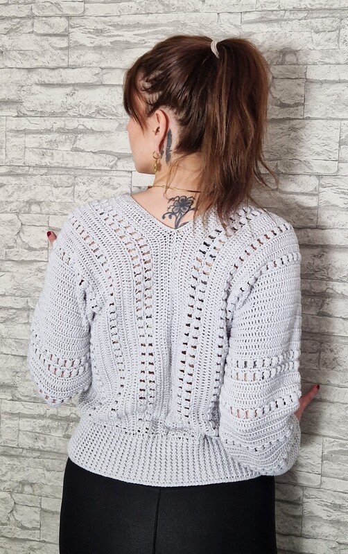 Man kann den Pullover auch leicht für größere Größen anpassen, indem man zusätzliche Stäbchenreihen einfügt.