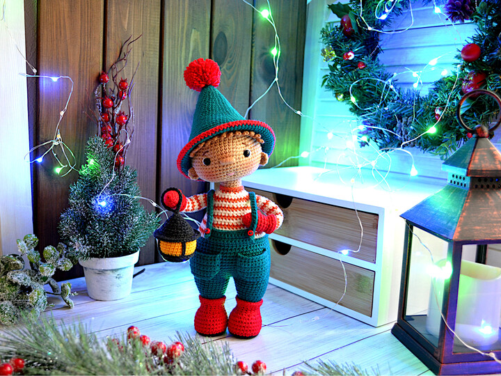 Das Muster enthält viele detaillierte Schritt-für-Schritt-Fotos sowie vollständige Musteranweisungen und Tipps zum Häkeln. Gnome OLIVER ist von den Fußsohlen bis zur Oberseite des Kopfes in einem Stück gehäkelt, sogar die Arme sind mit dem Körper verbunden. Nur die Schal und der Hut der Elfe sind abnehmbar. Alle anderen Kleidungsstücke sind fest mit der Puppe verbunden.