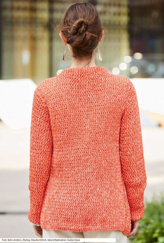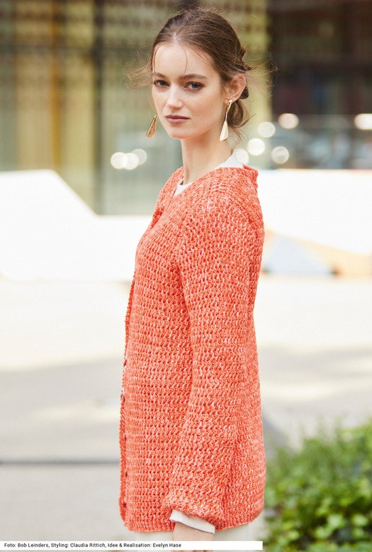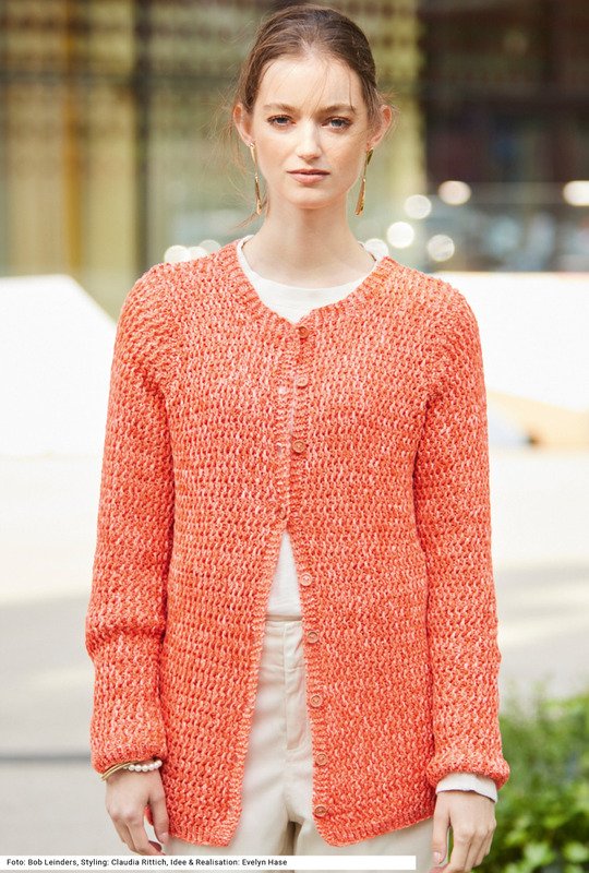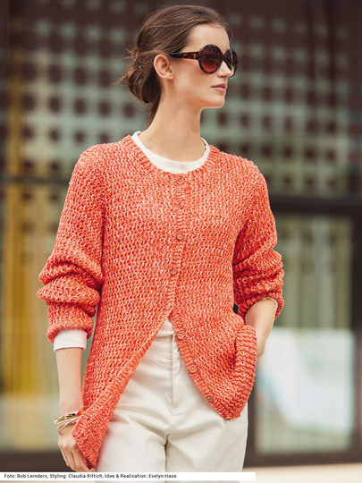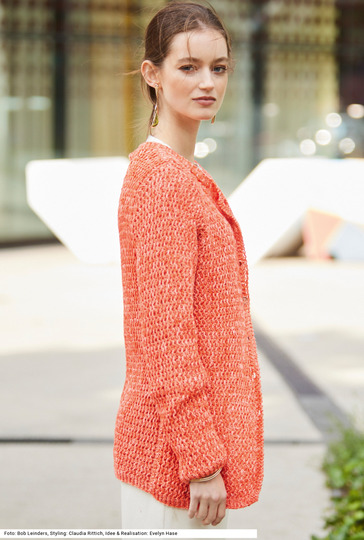 Dieser Cardigan zeichnet sich durch seine schillernde Oberfläche aus, die durch das melierte korallefarbene Baumwoll-Bändchengarn erzeugt wird. Die plastische Struktur des Musters entsteht durch rechte und linke Maschen, die in kurzen Abständen als Doppelmasche (d. h. es wird tiefer eingestochen) gestrickt werden. Der Bund und die Halsausschnittblende werden im Rippenmuster gearbeitet, die Knopfleiste jedoch wird kraus rechts gleich mitgestrickt. Ärmel mit Armkugel garantieren einen perfekten Sitz an den Schultern. Eine Anleitung steht für die Größen 36/38, 40/42 und 44/46 zur Verfügung.
