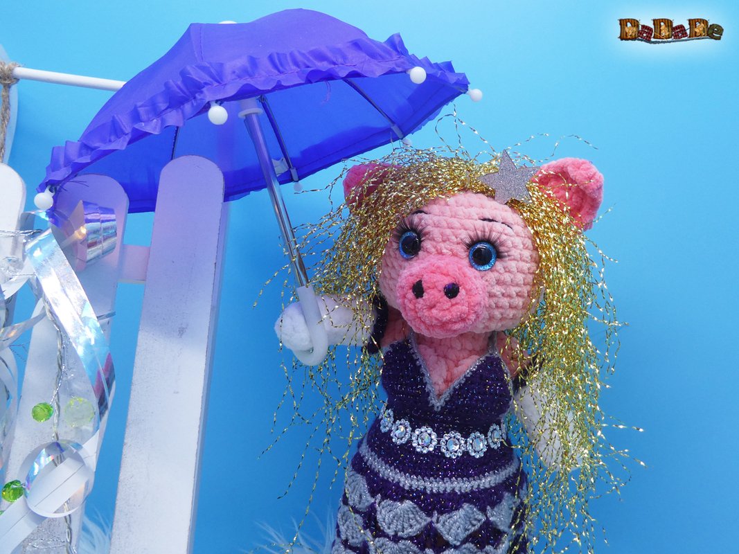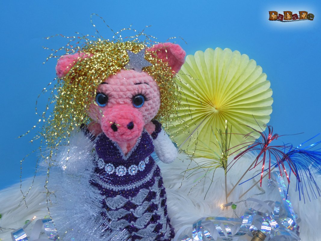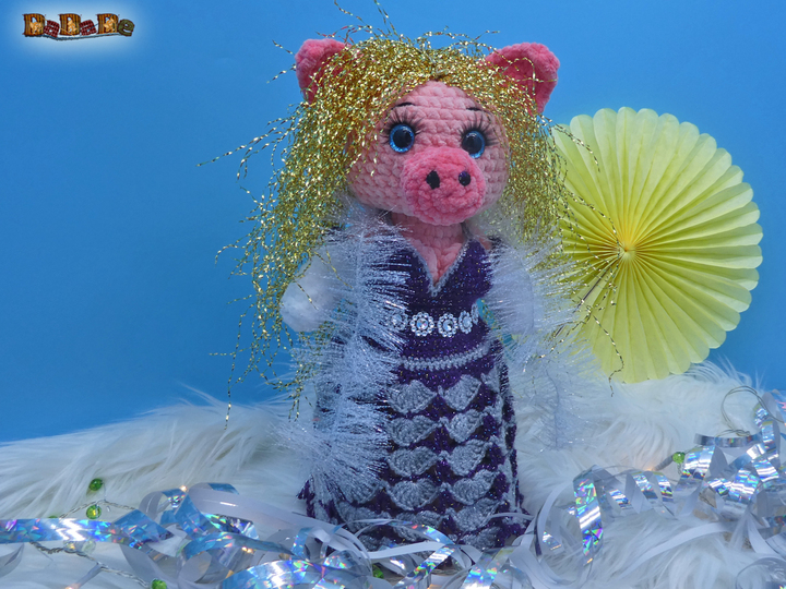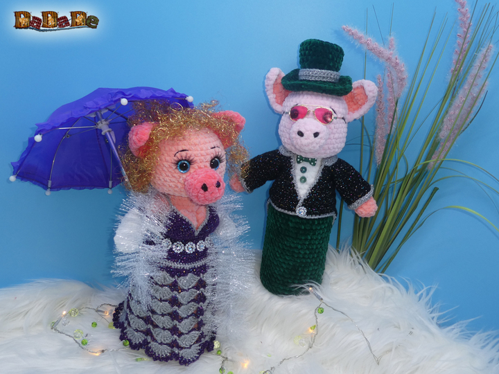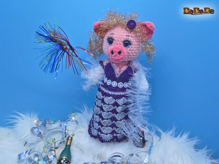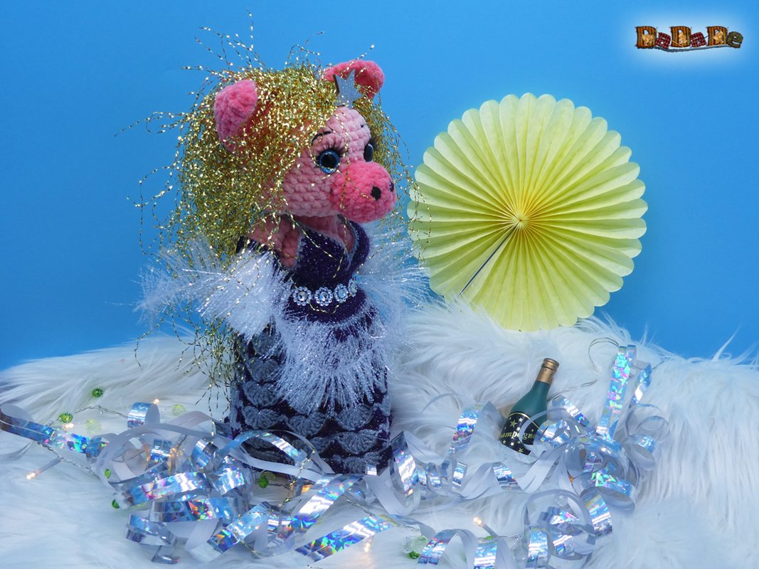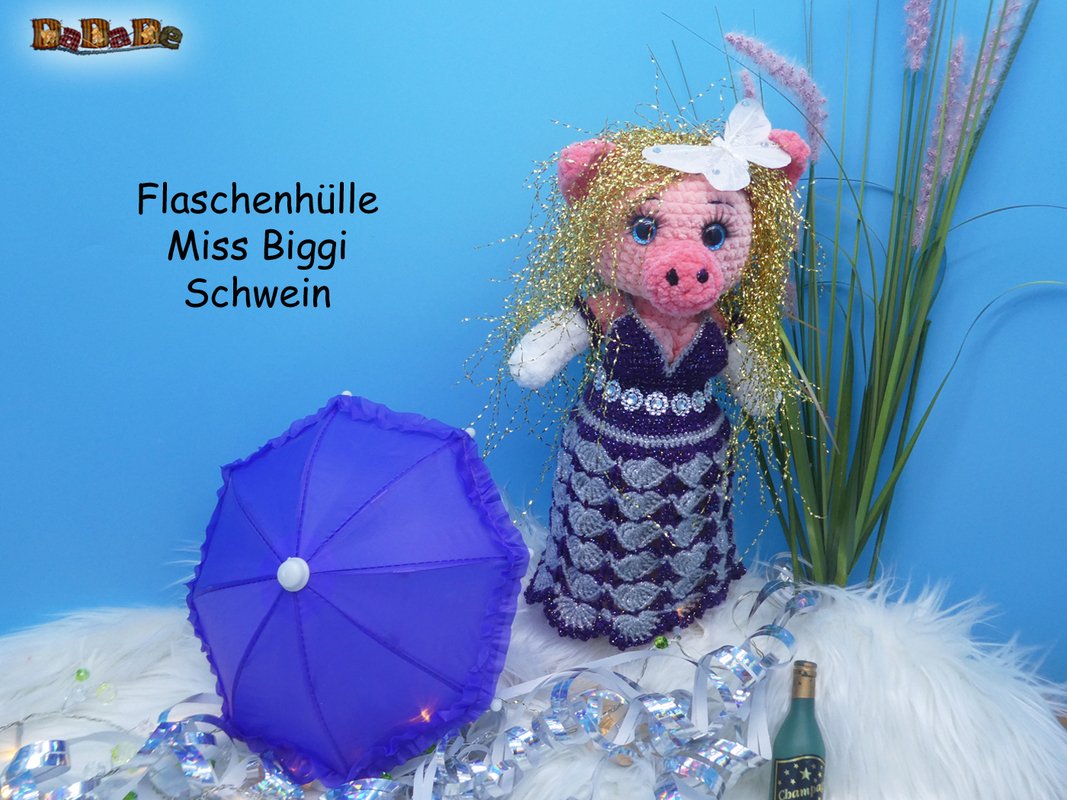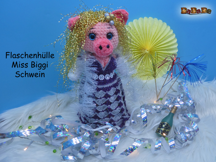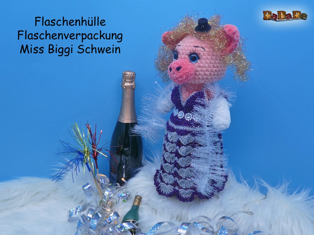 Hier kauft man die Häkelanleitung für diese tolle Silvester-Dekoration und Flaschen-Verpackung; die Flasche steckt im Schwein Mrs.Biggi
