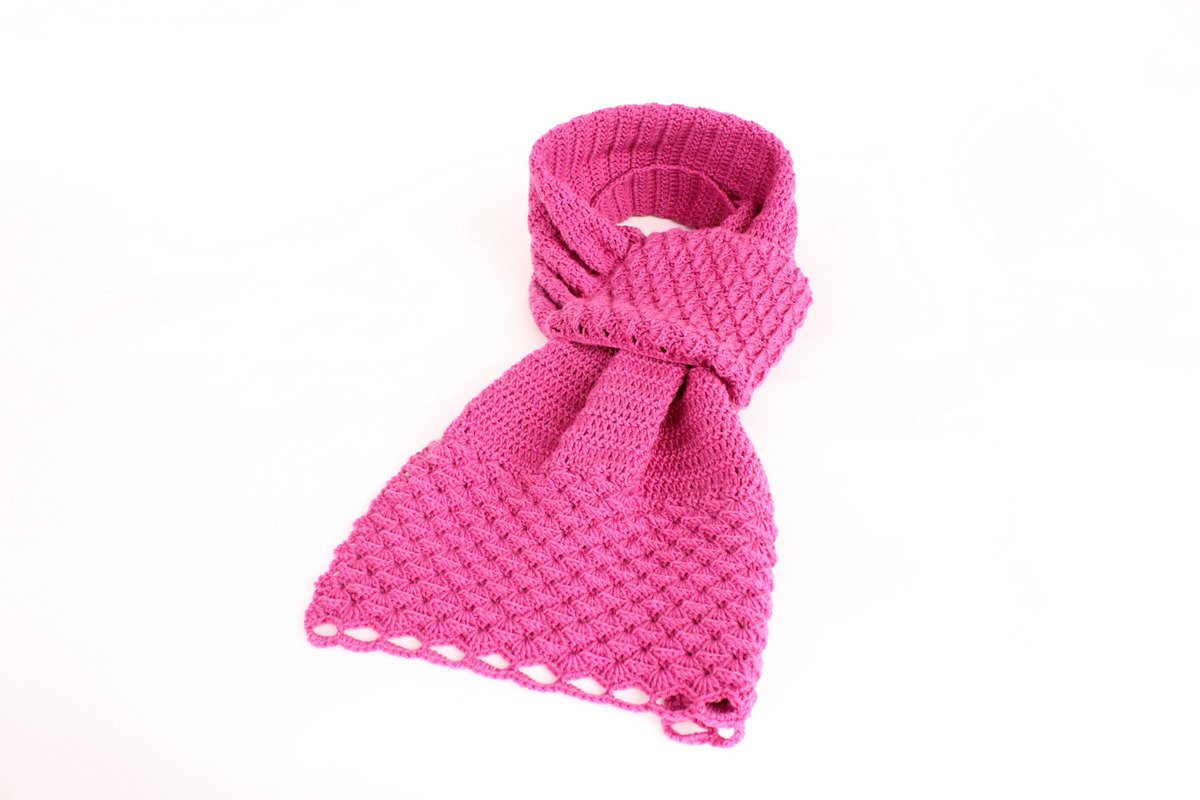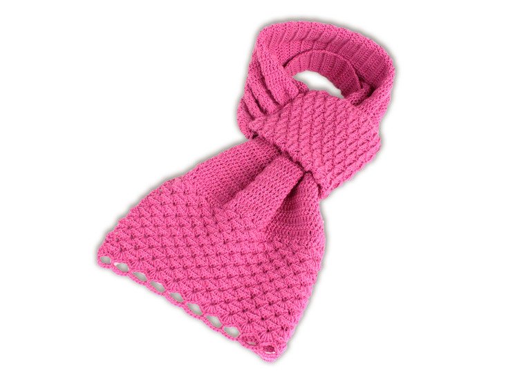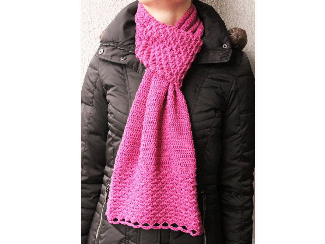 Diese Häkelanleitung besteht aus bebilderter Anleitung zum Häkeln eines Winterschals "Romanze" mit einem schön geprägten Muschelmuster. Damit können Sie einen schönen, außergewöhnlichen Schal für Sie, Ihre Freundin oder Verwandte häkeln. Der Schal wird durch das Ziehen des unteren Endes durch die obere Schlaufe angezogen, so dass Zuknoten gar nicht notwendig ist.
