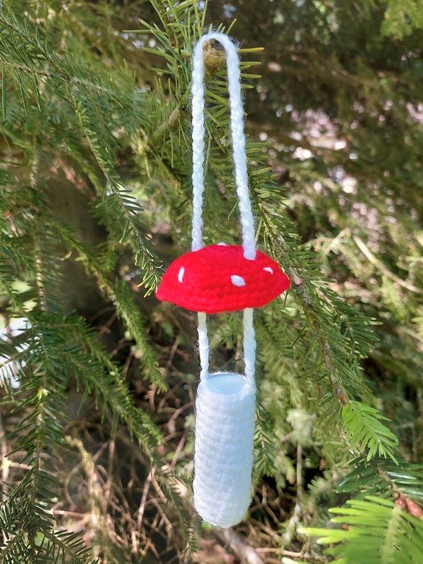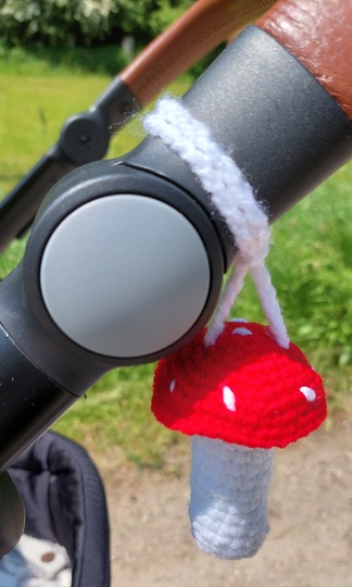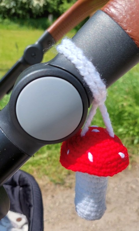 Die "Schnur" kann natürlich auch länger gehäkelt werden, kürzer würde ich sie nicht machen, da sonst der Pilz nicht mehr so gut durchpasst und man das Ganze nicht mehr richtig befestigen kann.