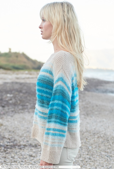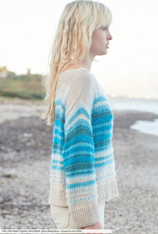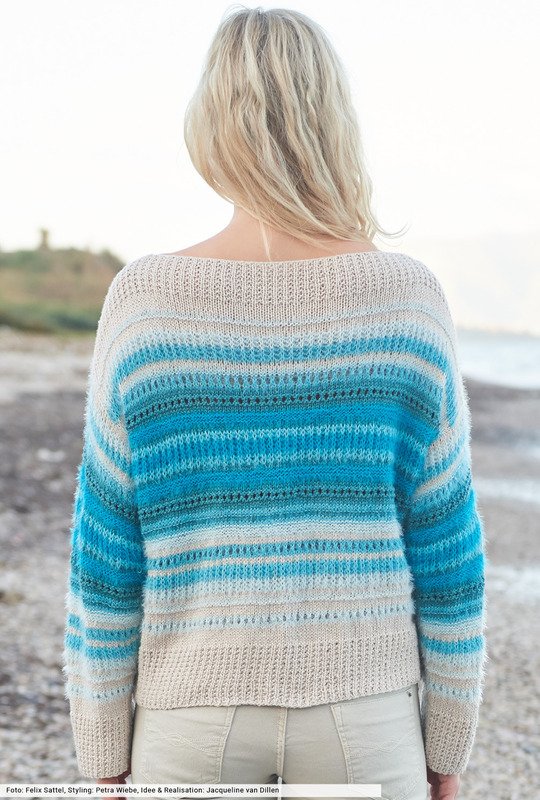 Der Schnitt gerade, die Muster sehr einfach – an diesen Pulli mit Streifenpasse und Lochreihen können sich auch Strickneulinge wagen. Für den spannenden Look sorgt aber nicht nur das Farbspiel unterschiedlicher Aquatöne. Auch der Mix aus unterschiedlichen Garnen zieht Blicke auf sich, denn glatte Schur- und Baumwolle geht mit dezentem Fransengarn auf Fashionstreife. Ein wunderbarer Pulli, der dich länger als eine Saison begleiten wird.