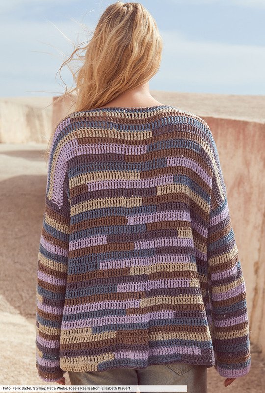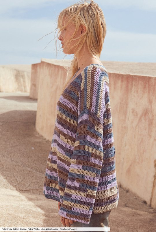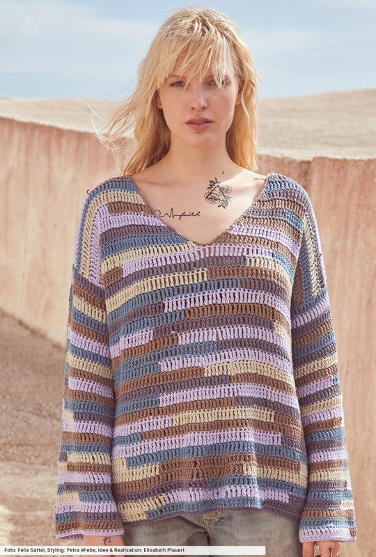 Hier geht's lang! Nämlich streifenweise, in unterschiedlichen Farben und in gehäkelter Intarsientechnik. Dafür findest du bei der Anleitung zwei übersichtliche Zählmuster, die dir die Arbeit erleichtern., da du auf einen Blick siehst, wo welche Farben zum Einsatz kommen. Mit tiefem V-Ausschnitt und geraden Ärmeln ein cooler Pulli, der den Spagat zwischen Berufsalltag und Laisses-Faire fast mühelos meistert.