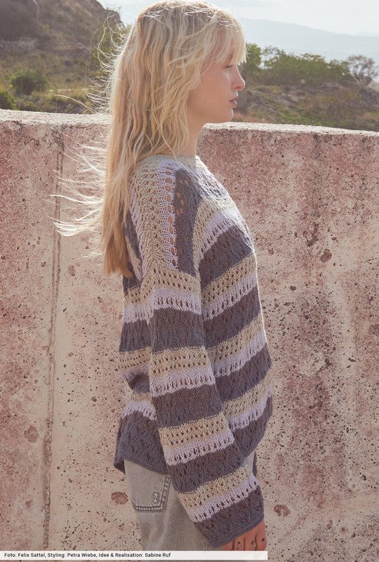 Muster für Muster entsteht hier ein Pulli, der modische Lässigkeit mit echtem Strick-Knowhow vereint. Der leicht verwaschene Eindruck entsteht durch die Wahl der Farben: Schiefer, Grège, Graunbraun und Flieder kommen im Mix in ihrer ganzen Vielschichtigkeit zum Ausdruck und sind eine Inspiration für die selbstbewusste, urbane Frau. Das Garn besteht aus Viskose mit Leinen und Baumwolle – die perfekte Mischung für warme Frühlingstage.