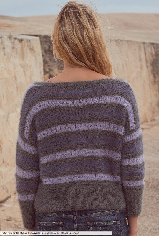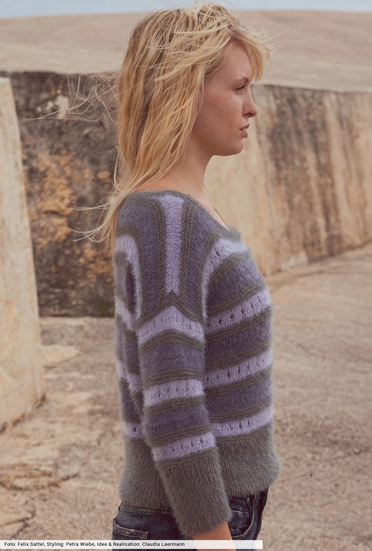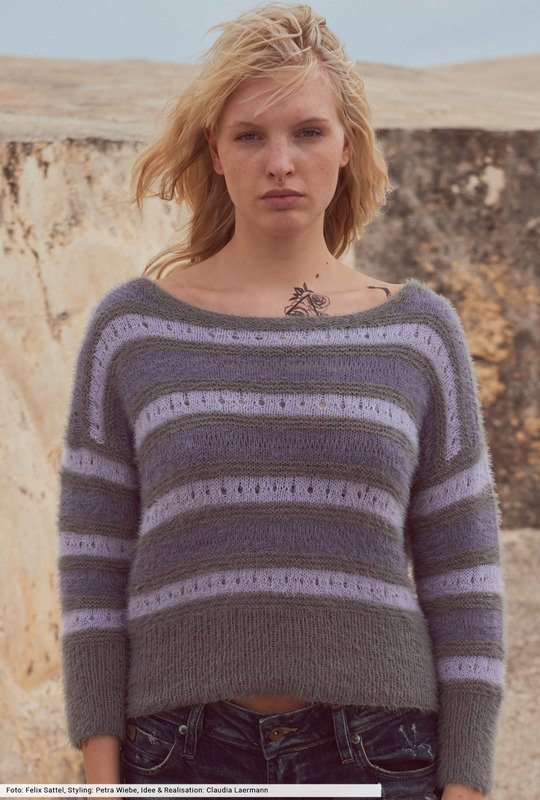 Used, bleached oder raw: Klassische Jeans-Farben bringen bei diesem Streifenpulli frühlingshafte Leichtigkeit und selbstbewusstes Savoir-Vivre in die Masche. Coole Details wie das dezente Fransengarn, das hier zum Einsatz kommt, sorgen für einen trendy Urban-Look, der sich länger als eine Saison in Szene setzt. Die einfachen Loch- und Fallmaschenmuster haben wir in unserer Anleitung genau beschrieben, sodass auch weniger versierte Strickerinnen zum Erfolg kommen.