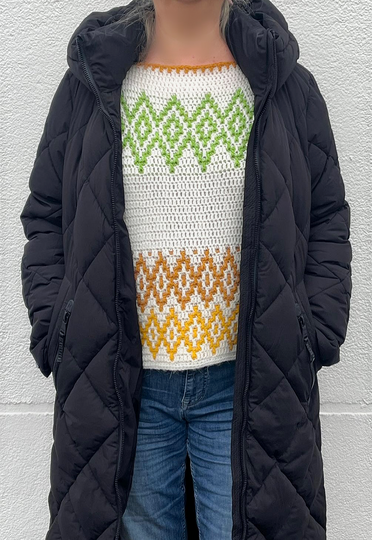 Um solche Muster häkeln zu können, nutzt man eine besondere Technik: Die Overlay Mosaic Crochet-Technik. Das Besondere daran ist, dass du in einer Reihe immer nur in einer Farbe häkelst. Du hast also nicht das Problem, gleichzeitig 2 Farben in einer Reihe managen zu müssen. Wie das geht? Das zeige ich ausführlich und mit vielen Fotos in dieser Anleitung. Kunden bestätigen, dass diese Technik sehr verständlich beschrieben wird. Es ist einfacher, als man zunächst glaubt. Such dir das Motiv aus, das du als Vorderteil häkeln möchtest. Das Rückenteil könnte dann schlicht ohne Muster gehalten werden.