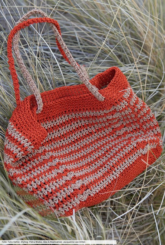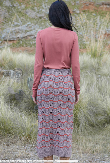 Wer modisch etwas auf sich hält, hat eine dabei: Ohne Tasche geht nichts. Hier ein besonders schönes Exemplar, das wir aus einem stabilen Baumwoll-Synthetikgarn in Camel und Terrakotta gehäkelt haben. Passend dazu der schmale Rock: Er ist knielang und begeistert mit einem zweifarbigen Wellenmix in Graubraun und Rostrot. Für die Bewegungsfreiheit sorgt ein hoher Seitenschlitz, ein Gummiband bringt alles auf Taille.