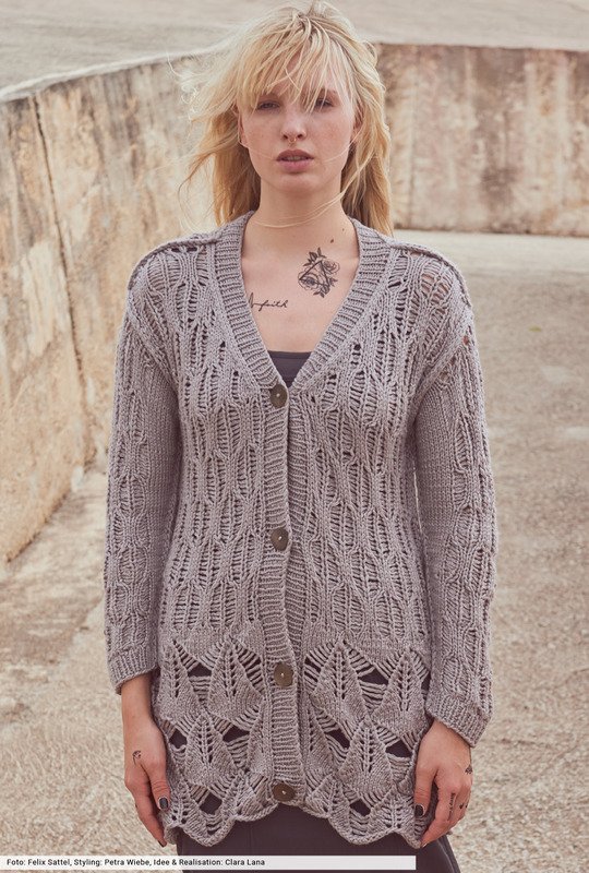 Perfekt unperfekt! Die Optik dieser hüftlangen Jacke lebt von Spiel mit Fallmaschen. Dadurch entstehen mal mehr, mal weniger große Löcher, die dem Strickbild die spannende Optik verleihen. Wir haben für dich zwei Strickschriften erstellt, nach denen du arbeiten kannst. Tipp: Erstelle eine kleine Maschenprobe, dann geht später die Arbeit umso schneller von der Nadel. Schmale Rippenblenden halten alles schön in Form, farblich passende, leicht changierende Knöpfe komplettieren den Look.