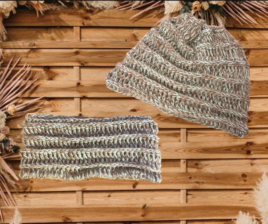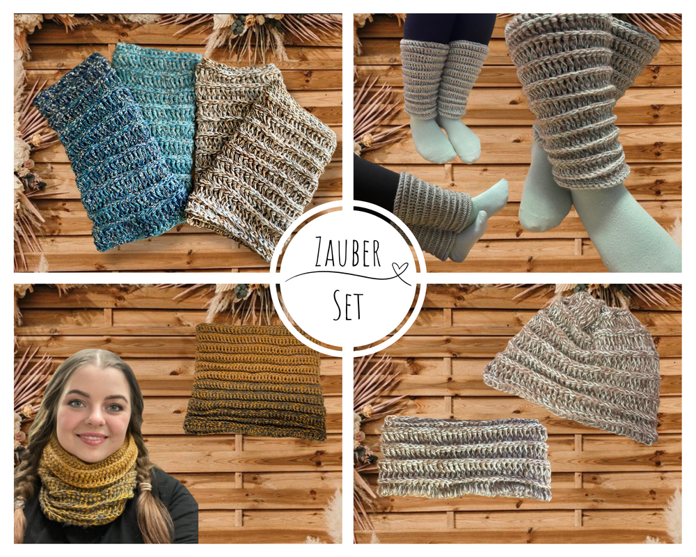 In diesem Set (5 Anleitungen) kann man Häkelanleitungen für Mütze/Stirnband/Halssocke/Beinstulpen & Handstulpen erwerben. Man kann aber auch einen Loop & Muff arbeiten.