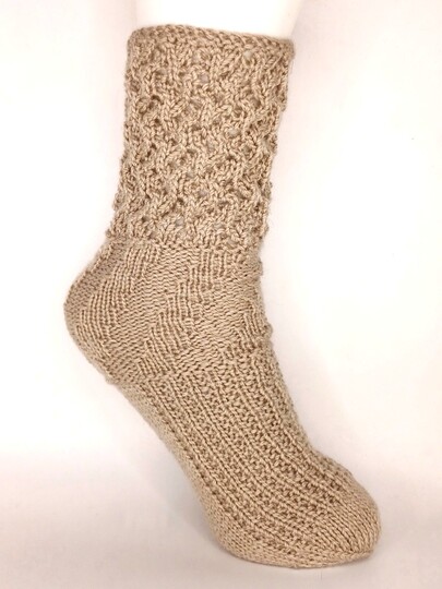 Maschenprobe: 6-fach Sockenwolle, Nadelstärke 2,5-3mm, 10 x 10 cm = 38 Reihen und 24 Maschen.