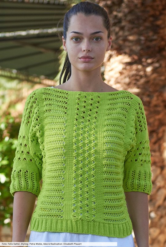Von Ärmel zu Ärmel gestrickt präsentieren sich bei diesem lässigen Fledermauspulli die Lochmusterstreifen und das Fallmaschenmuster in ganz neuer Optik. Die Lochmuster haben wir in der Anleitung genau beschrieben, für die Fallmaschen findest du in unserer Anleitung eine kleine Strickschrift. Auf jeden Fall kommen durch das griffige Baumwollbändchen die Strukturen toll zur Geltung – ein Garant für extrem bequemen Tragekomfort.