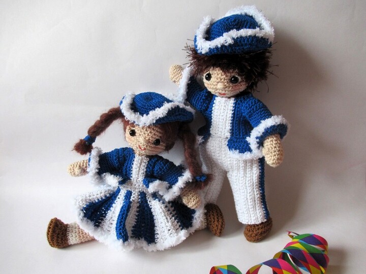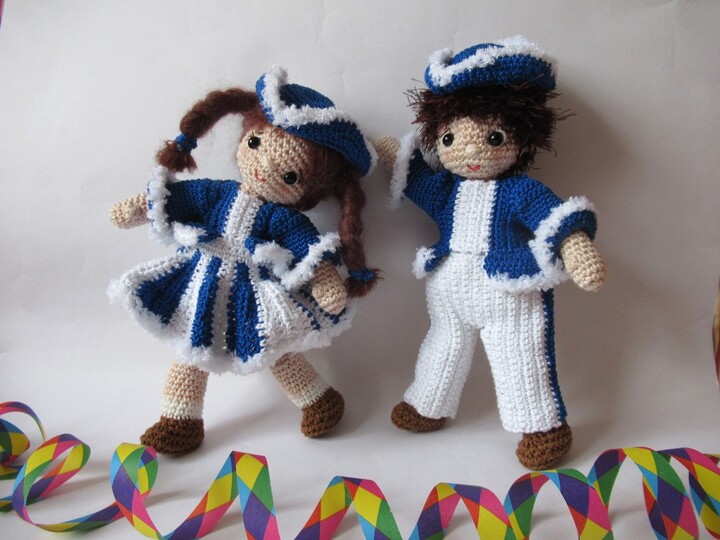 Anna und Anton lieben die närrische Zeit. Als Tanzmariechen und Funkenmajor amüsieren sie sich auf dem Karneval. Annas Kleidchen hat einen weit schwingenden Rock. Auf dem Kopf trägt sie einen Dreispitz. Auch Anton trägt einen Dreispitz. Sein Anzug, besteht aus einer blauen Jacke und einer weißen Hose mit blauen Seitenstreifen. Die Kleidung kann man an- und ausziehen, so dass Anna und Anton auch andere Puppenkleider tragen können.