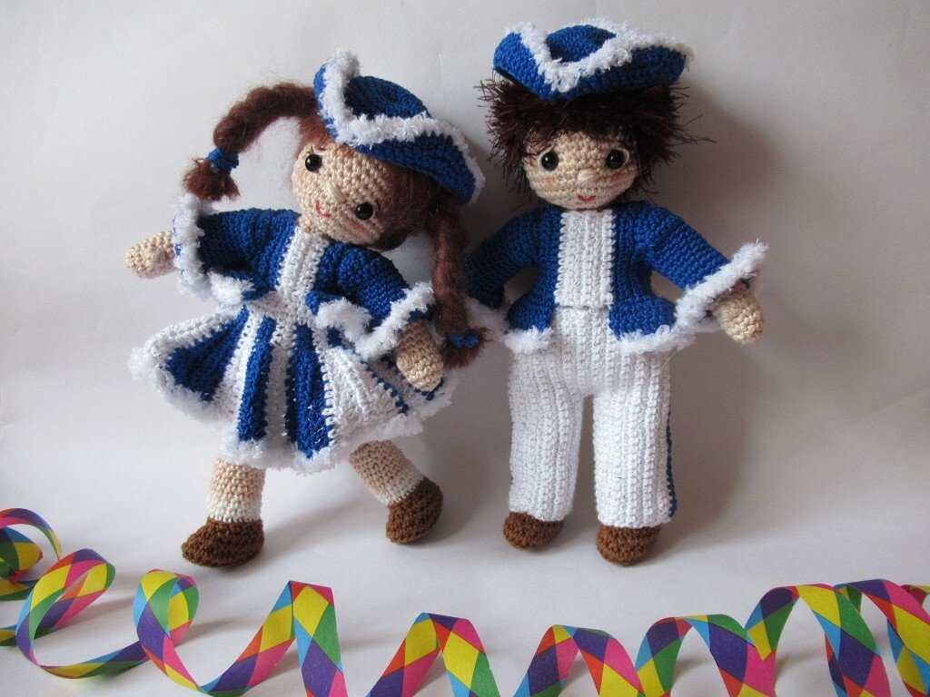 Für meine Häkelpüppchen Anna und Anton habe ich die Faschingskostüme "Tanzmariechen und Funkenmajor" entworfen. Das Set ist ein Ergänzungsset zu "Anna und Anton, die kleinen Gratulanten" ( https://www.crazypatterns.net/de/items/90919/haekelanleitung-anna-und-anton-die-kleinen-gratulanten) und besteht aus einer langen Hose mit Seitenstreifen, einer langen Jacke und einem Dreispitzhut für Anton, sowie einem Kleid mit weitem Streifenrock und einem Dreispitz für Anna. Die Anleitung für die Puppen ist nicht inbegriffen..