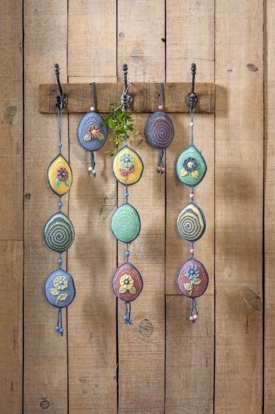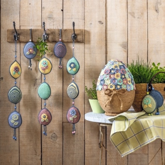 dekorative Eiergirlanden, Anhänger und ein prächtiges Osterei mit lauter