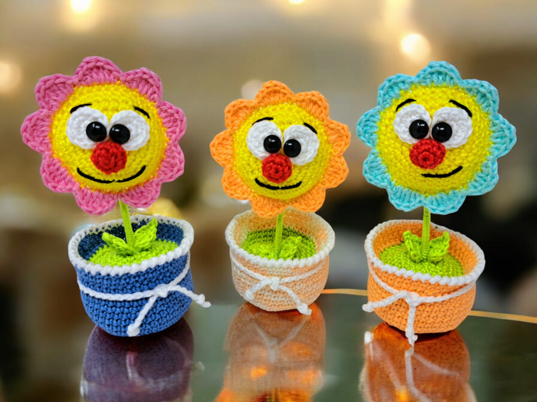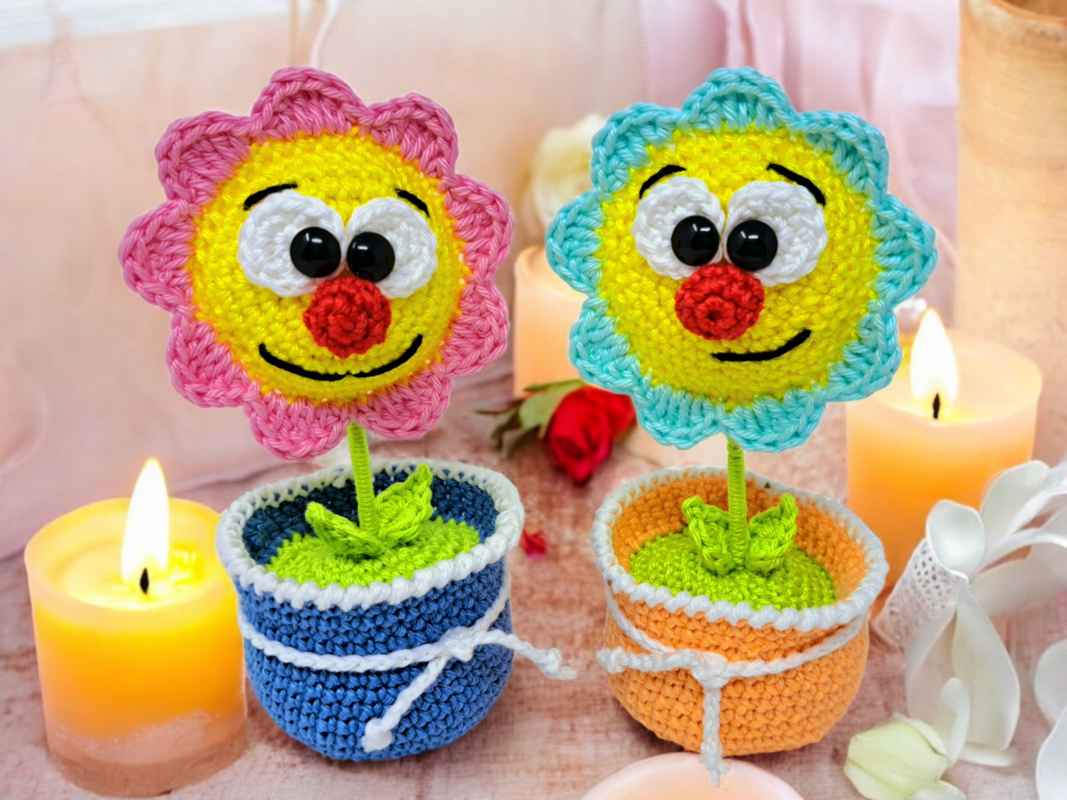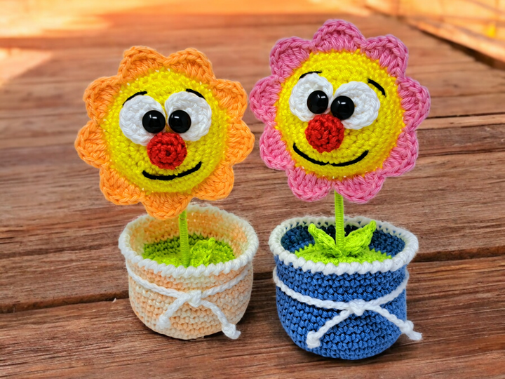Hole dir Farbe und Freude in dein Zuhause mit diesen gehäkelten Blumen und ihrem lustigem Gesicht!