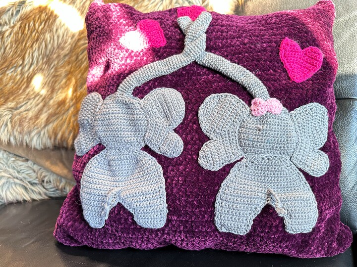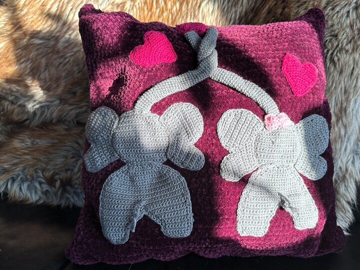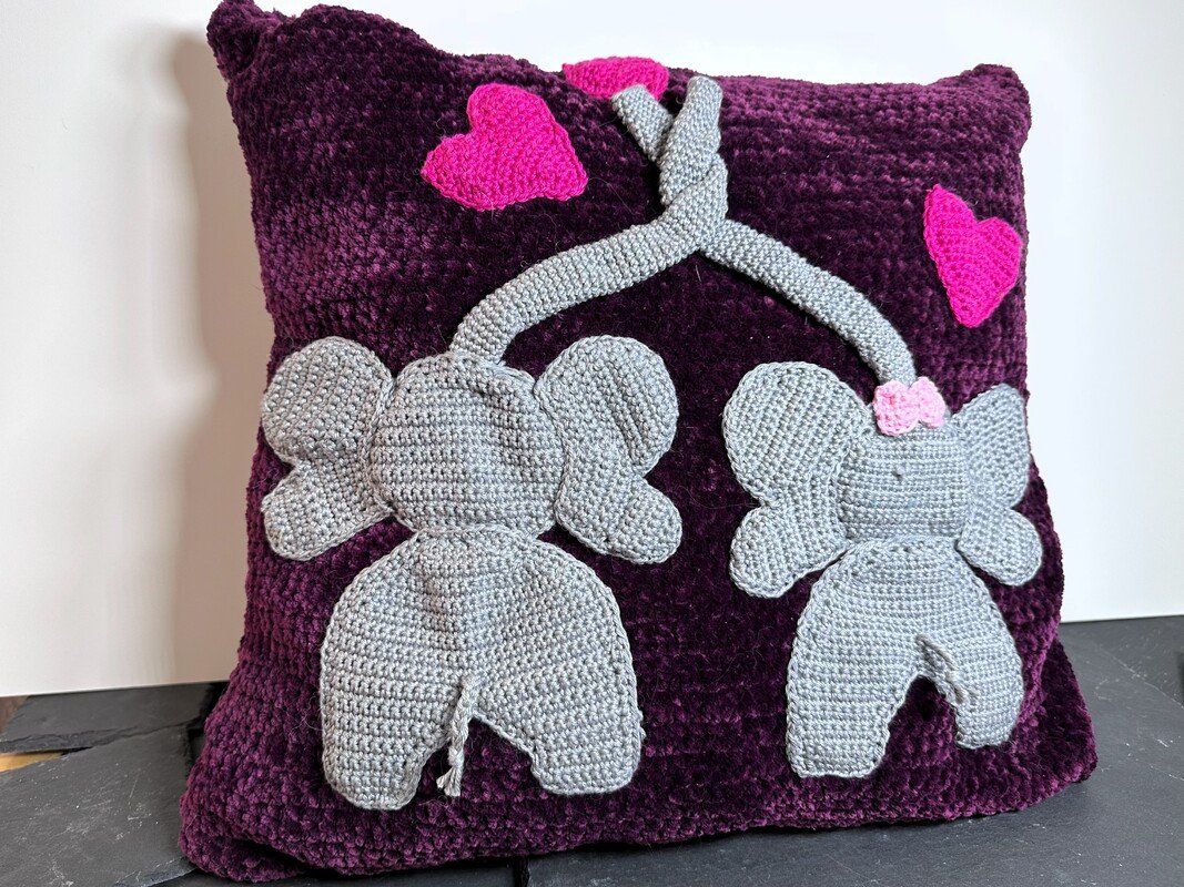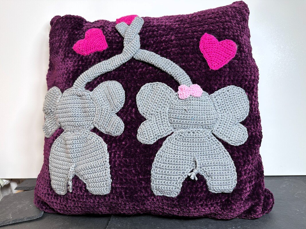 Ihr kauft hier eine Häkelanleitung zum Nacharbeiten dieses Kissens mit den süssen Elefanten. Das Kissen kann entweder mit einem handelsüblichen Kissen (40x40cm) gefüllt werden oder gestopft werden. Ein Muss für alle Elefantenliebhaber.