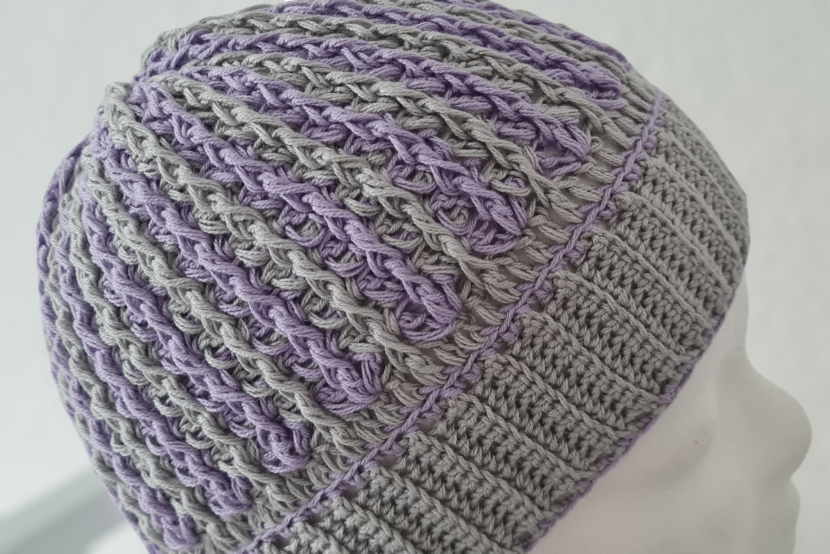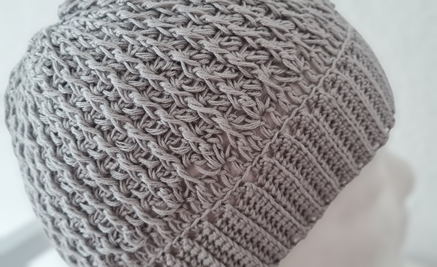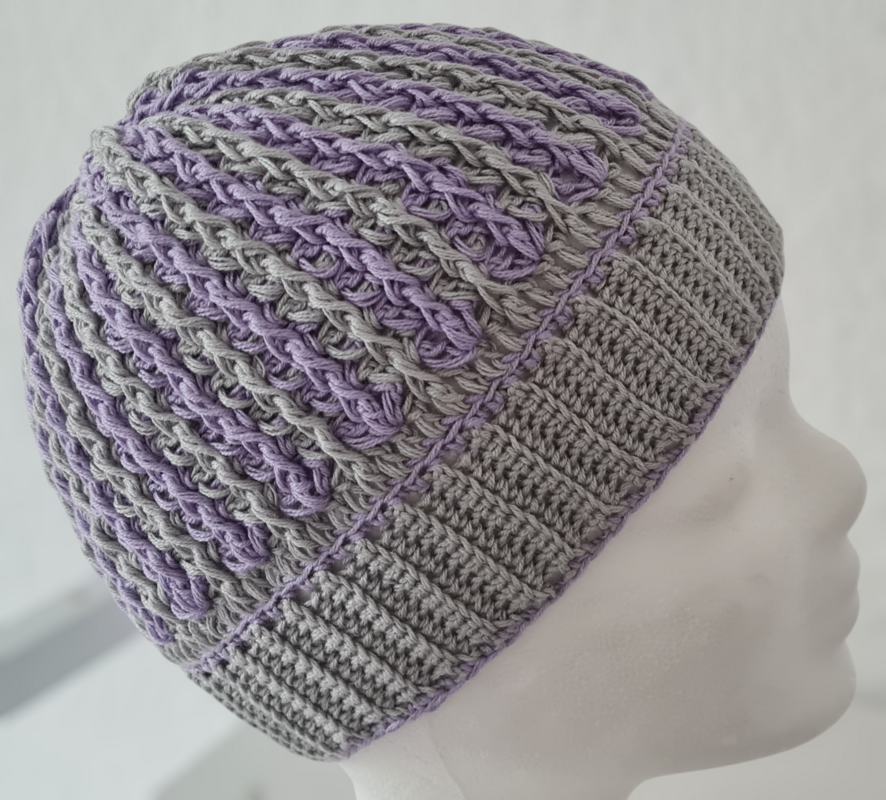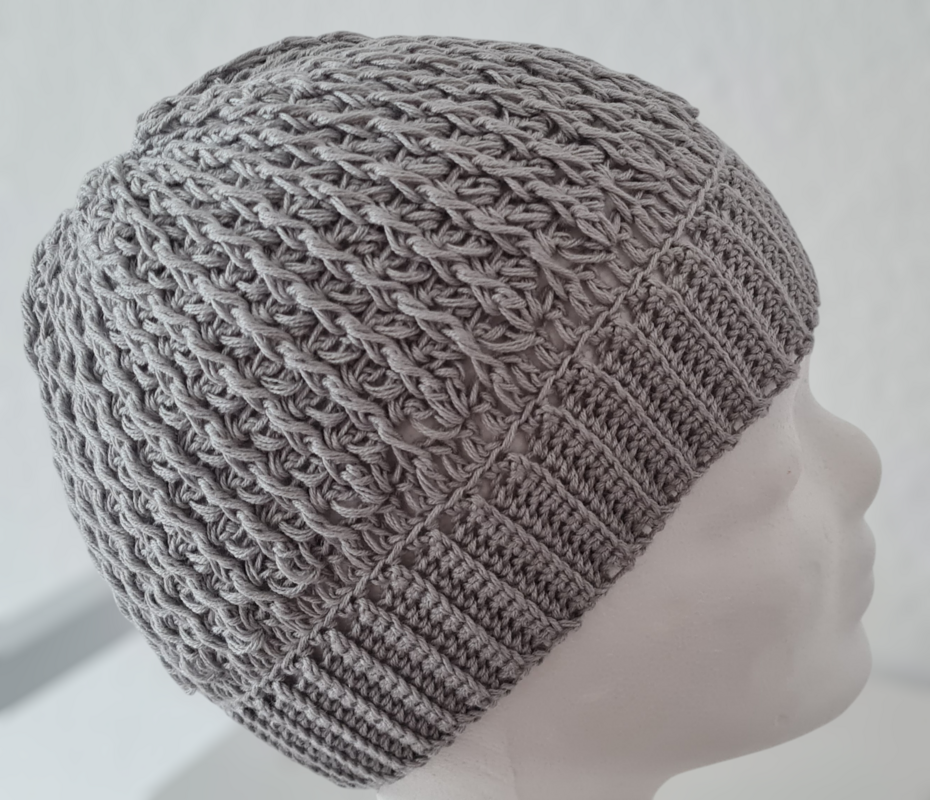 Die Mütze wird von unten nach oben und komplett ohne Zu- oder Abnahmen gehäkelt.