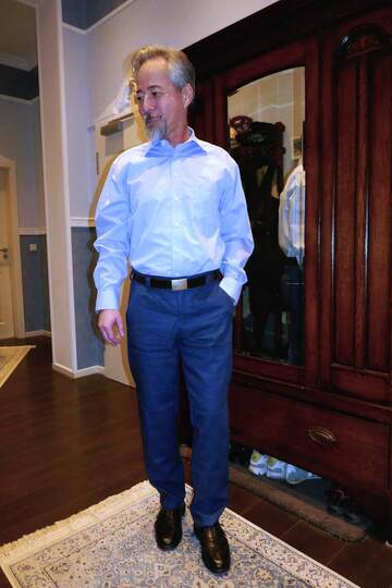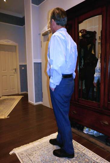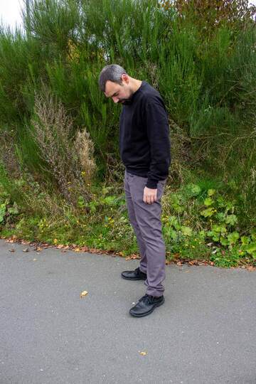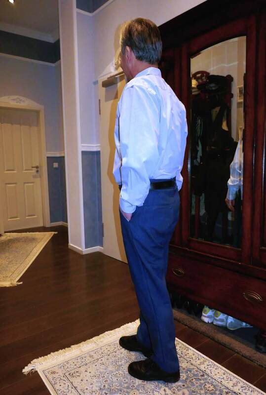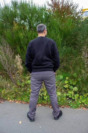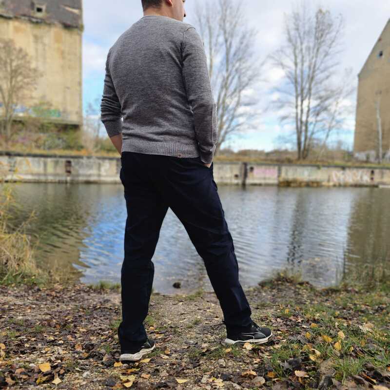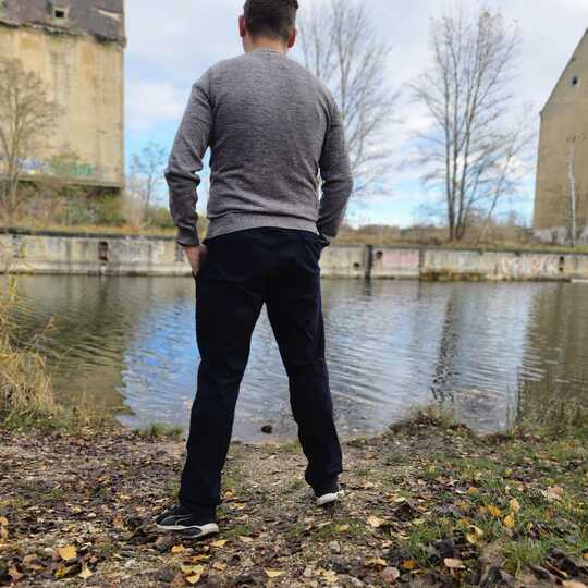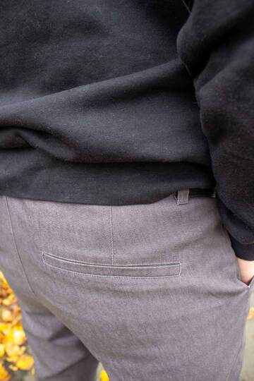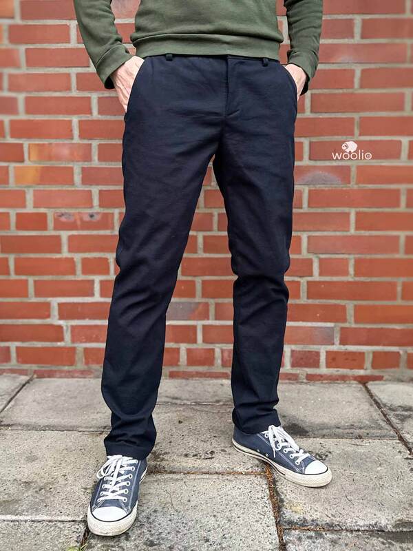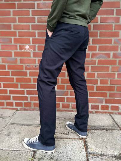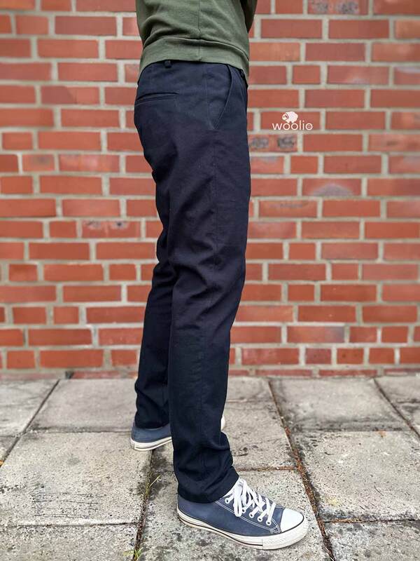 Dieser Schnitt für eine Chinohose mit schrägen Eingrifftaschen, Leistentaschen im Gesäßbereich und einer Leistentasche vorne rechts für den 5-Pocket-Stil, einem festen Bund mit Hosenreißverschluss und einem mäßig weiten Bein (regular fit), trägt den schönen Namen "Hauch von Ferne".