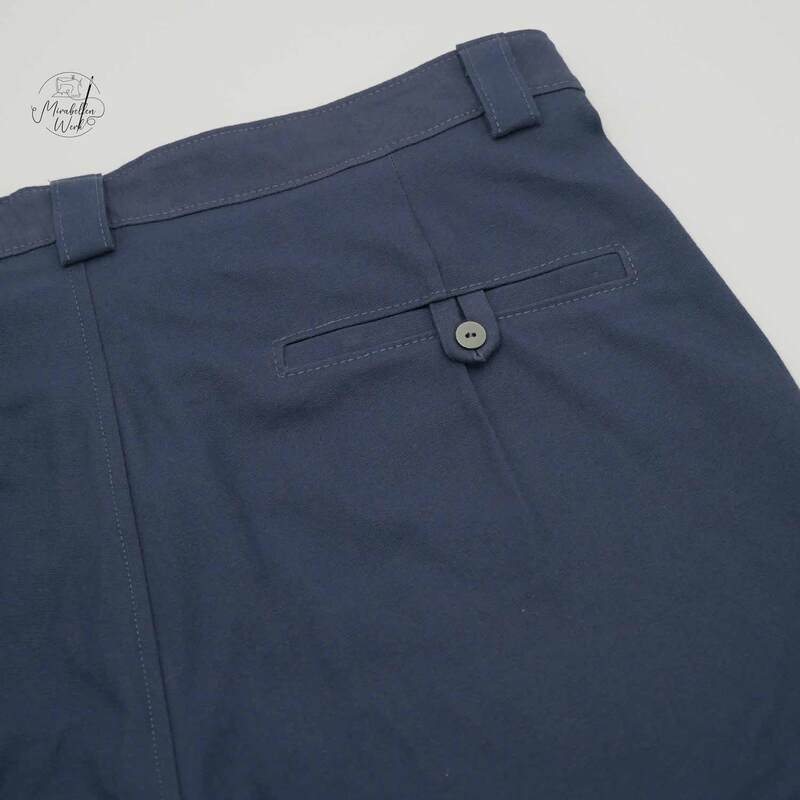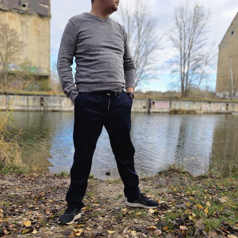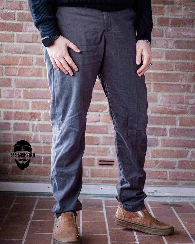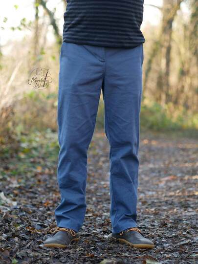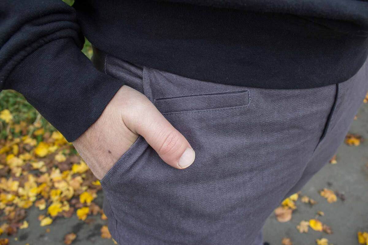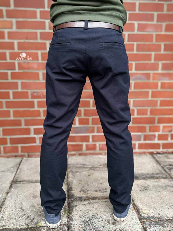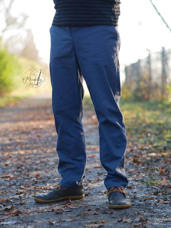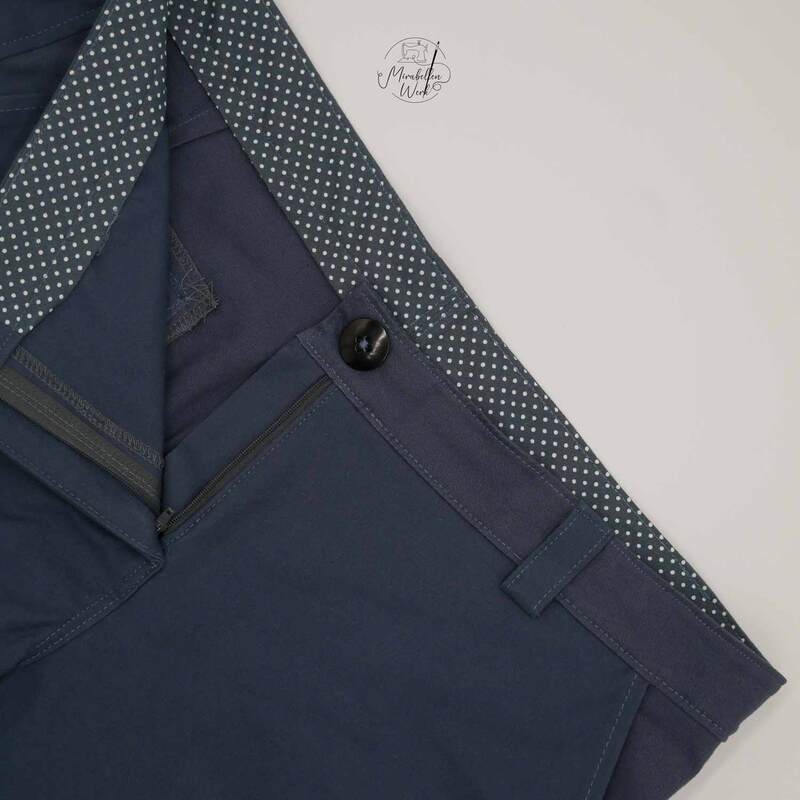 Als Material eignet sich Hosenstoffe wie z.B. Baumwolltwill, Baumwollköper, Leinen-Mischgewebe, Leinen, Jeans (nicht zu dick), Cord, und viele weitere (max. 3% Elasthan), sowie Baumwollstoffe für die Taschenbeutel und den inneren Bund.