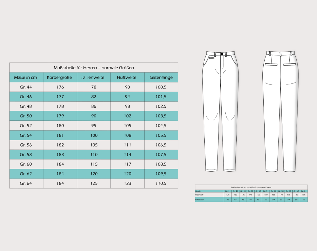Im Schnittmuster enthalten sind die Herrengrößen 44 - 64.
