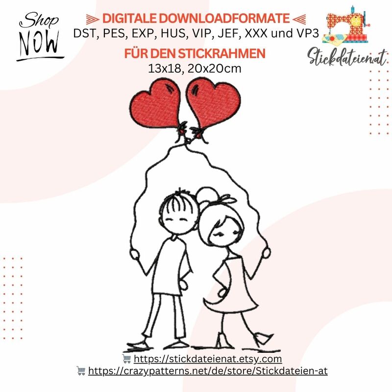 Diese entzückende Stickdatei zeigt ein Liebespaar als Strichmännchen, das Hand in Hand geht.
