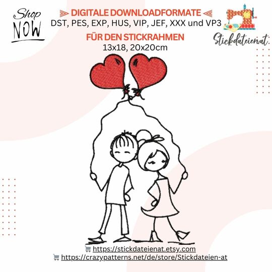 Die Datei kommt in zwei verschiedenen Größen, sodass Sie die perfekte Passform für Ihr Projekt finden können. Ob Sie nun ein T-Shirt, eine Tasche, ein Kissen oder etwas anderes besticken möchten, dieses Strichmännchen-Liebespaar wird sicherlich für ein Lächeln sorgen.