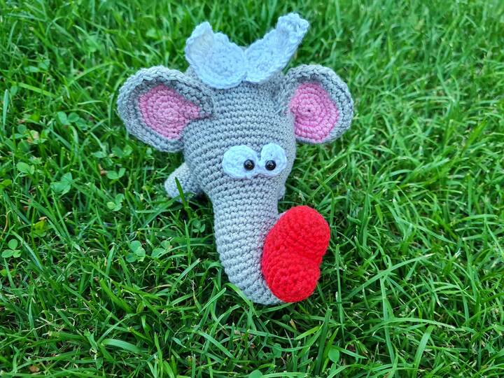 Der fertige Elefant ist mit Garn in Lauflänge (125g/50m) ca. 11 cm groß.