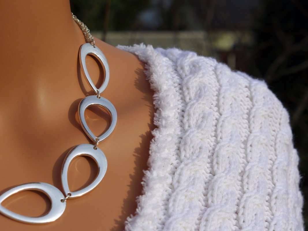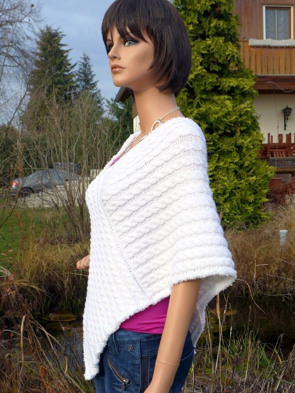 Der Kurz-Poncho ist der ideale Begleiter für kühle Tage im Haus. Einfach überwerfen und sich wohlfühlen. Er wärmt angenehm ohne einzuengen. Er ist für die Kleidergrößen 38 bis 42 (S/M) konzipiert. Seine Ärmel gehen bei einer Körpergröße bis 1,65 m bis zum Ellenbogen, deshalb stört nichts beim Hantieren im Haushalt oder am PC. Das zarte Zopfmuster wirkt schlicht und elegant zugleich. Das verstrickte Garn besteht aus 100 % purer extrafeiner Merinowolle und ist ganz schmuseweich. Die glatte Garnoberfläche gibt es ein klares Maschenbild und das Zopfmuster kommt gut heraus.