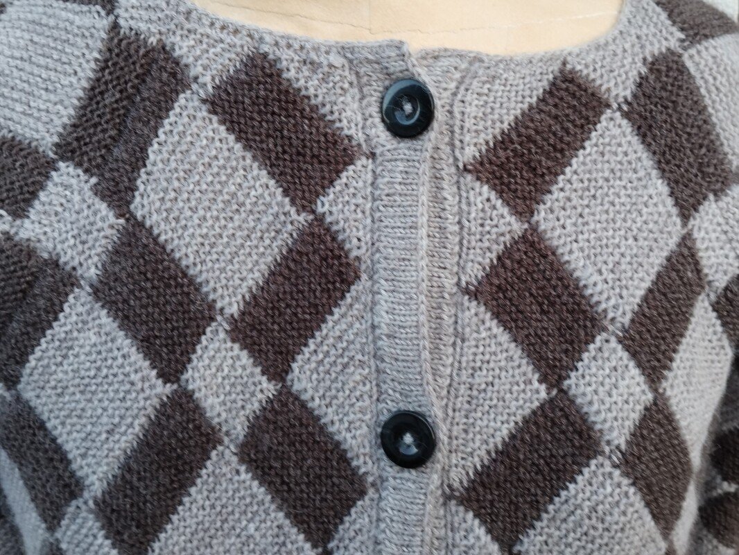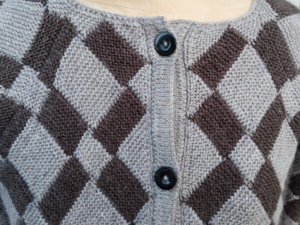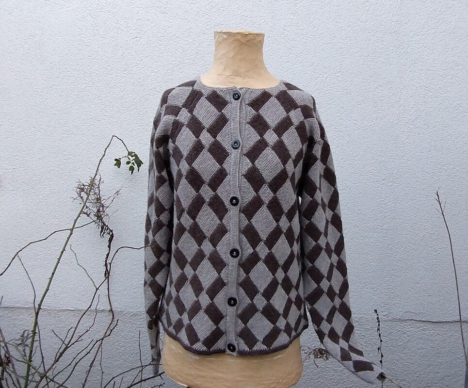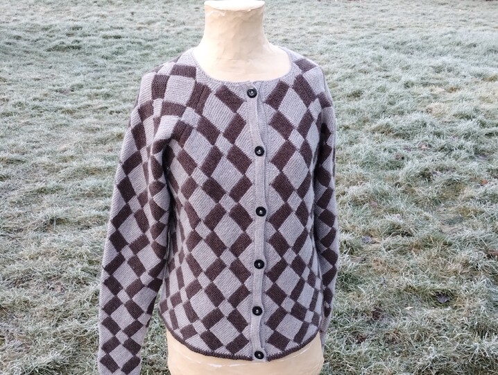 Anleitung für eine Raglan-Jacke in dünner Sockenwolle, die von oben nach unten im verzerrtem Entrelac-Muster gestrickt wird.