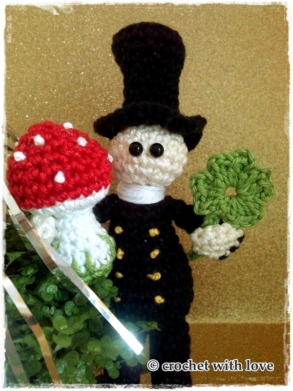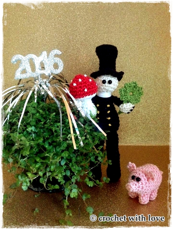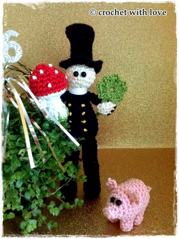 Häkelanleitung für einen Schornsteinfeger mit Glückspilz und Schweinchen
