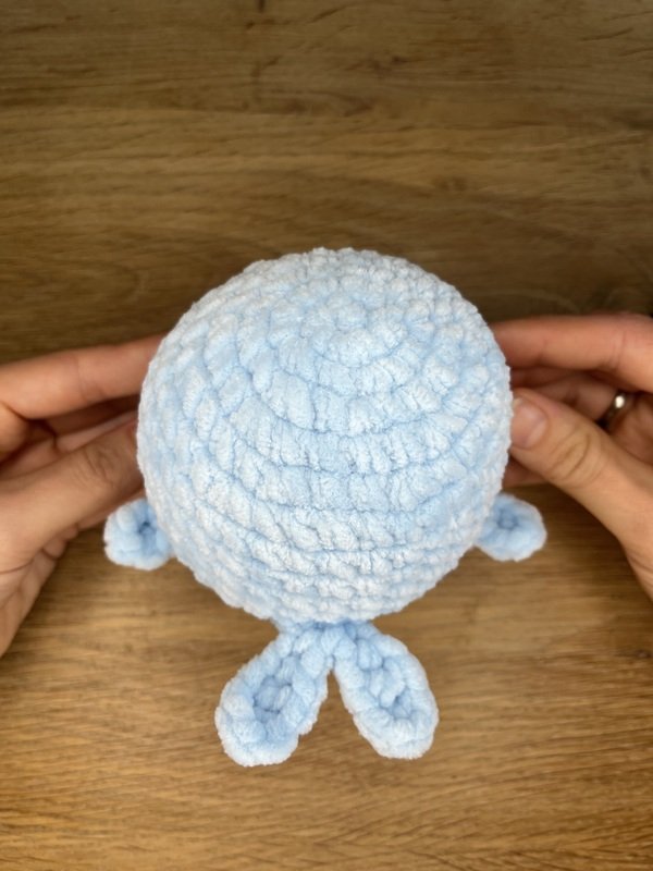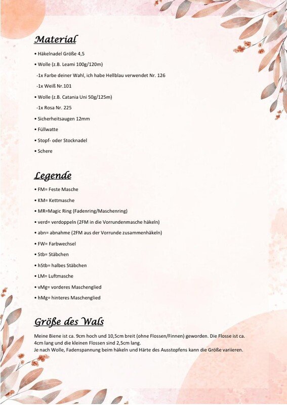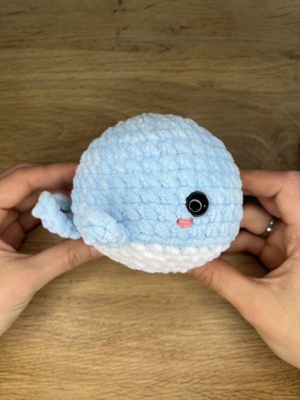 Mein Wal ist ca. 9cm hoch und 10,5cm breit (ohne Flossen/Finnen) geworden. Die Flosse ist ca. 4cm lang und die kleinen Flossen sind 2,5cm lang.