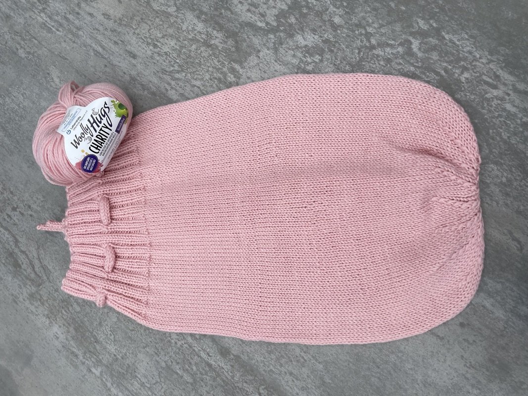 Material: Woolly Hugs CHARITY (75% Wolle, 15% Polyamid, 10% Polylactid, LL = 100 m/50 g) von L&K für den Pucksack 150 g Rosa oder Blau