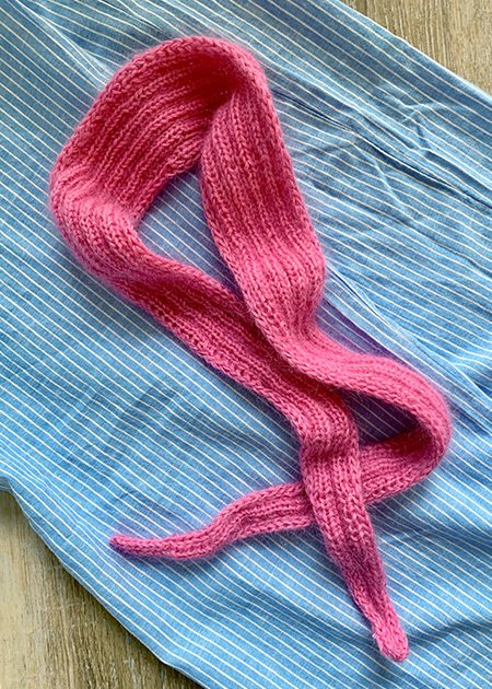Der pinke Lotta Scarf Light wurde in “Arwetta” (Fb. 313) und “Tilia” (Fb. 313) von Filcolana gestrickt.