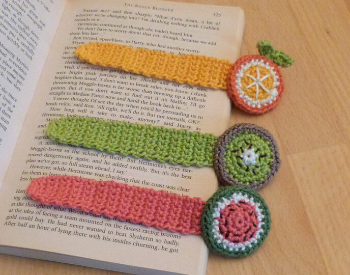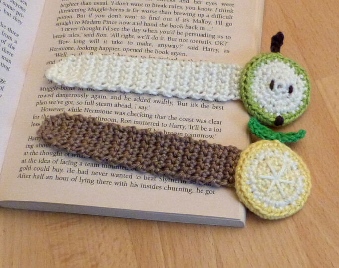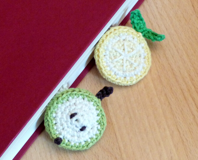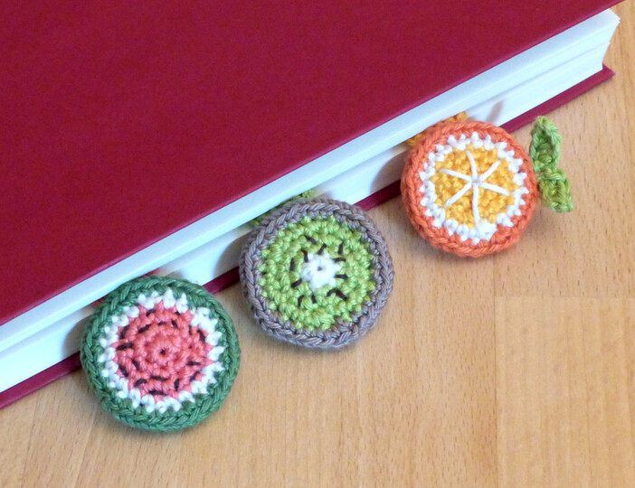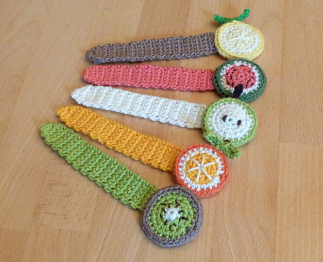 Anders als die meisten Lesezeichen, die senkrecht ins Buch gelegt werden und oben herausschauen, werden die Früchte-Lesezeichen quer zwischen die Seiten geklemmt, die Frucht hängt seitlich heraus und markiert so die Stelle an der man weiterlesen möchte. Ein hübsches kleines Mitbringsel für Leseratten und auch gut geeignet als Mitgebsel beim Kindergeburtstag!