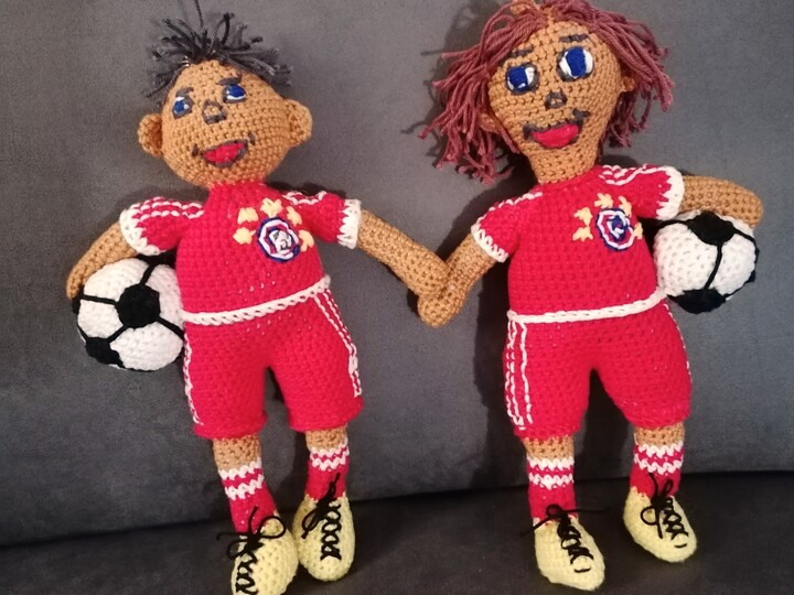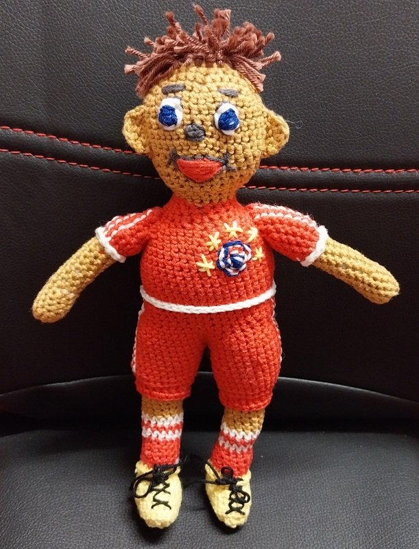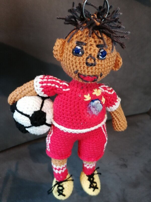 Das Fussballer-Püppchen ist ca 25 cm groß mit 100 % Baumwolle und Nadel 2,5 gehäkelt