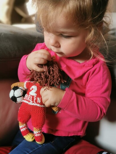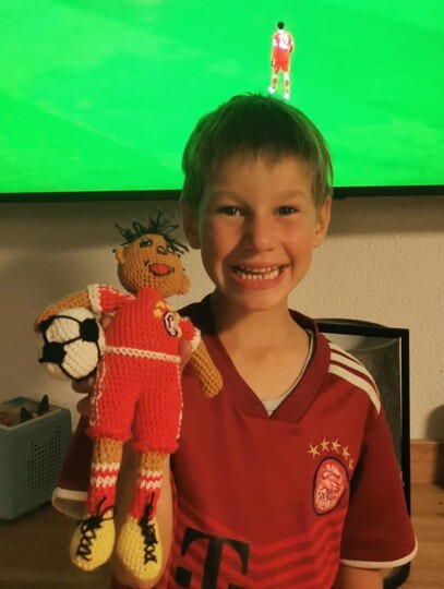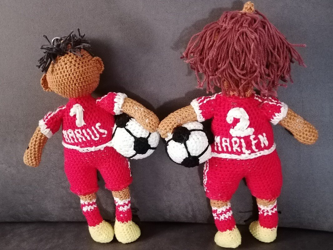 Mein Enkel ist großer Fußball Fan, und zu seiner Einschulung 2023 habe ich ihm dieses „Maskottchen“ ca. 25 cm groß, frei nach Bildern entworfen. Er hatte sich wahnsinnig darüber gefreut und seine kleine Schwester wollte dann auch unbedingt eines haben. Also habe ich es nochmals gehäkelt. Nachdem ich dann auf Wunsch ein Drittes häkeln sollte, habe ich dieses optimiert und dann diese, meine 1. Anleitung, aufgeschrieben und mit vielen Bildern dokumentiert. Man kann natürlich individuell die Farben der Püppchen selber variieren und mit eigenen Namen und Nummern anpassen.