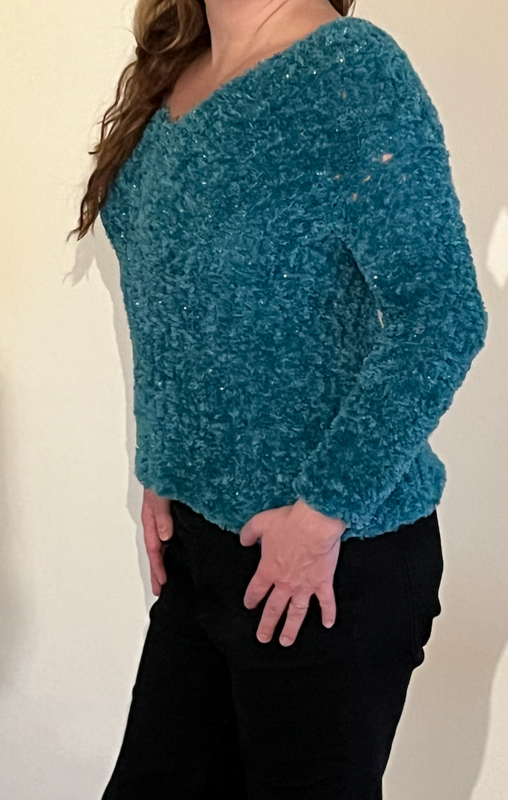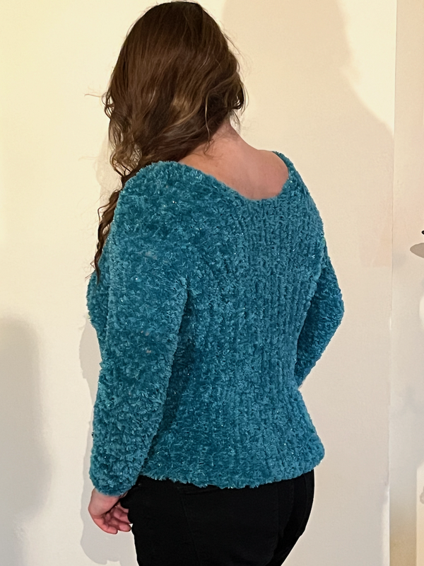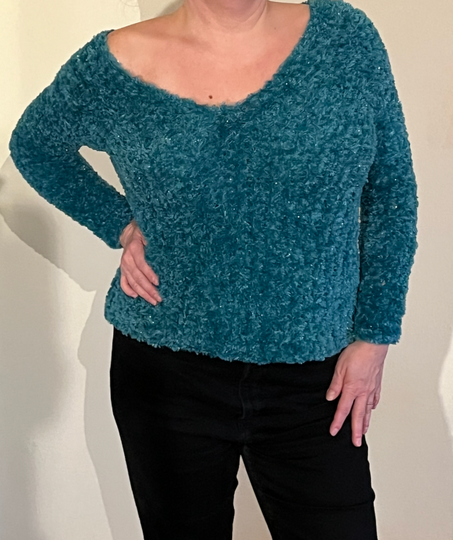 Diese Häkelanleitung ist perfekt für flauschiges Effektgarn geeignet. Der Pulli wird komplett mit festen Maschen gehäkelt, da das flauschige Garn an sich schon Effekt zeigt. Das Gltzern der Wolle gibt dem Pulli einen eleganten Touch.