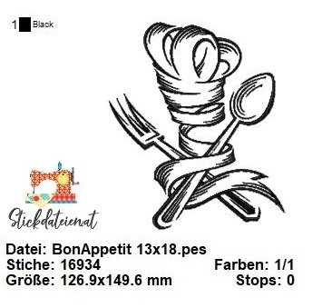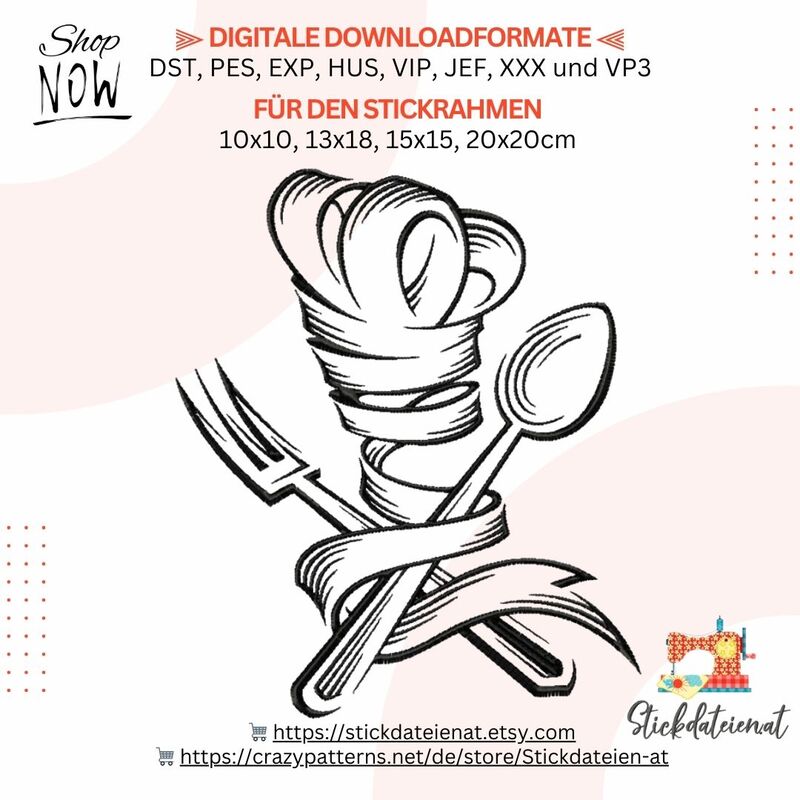 Sie zeigt eine stilvolle Kombination aus Gabel, Löffel und Kochmütze, perfekt für alle, die ihre Liebe zur Küche kreativ ausdrücken möchten. Ob Schürzen, Küchentücher oder Kochjacken – verleihe deinen Textilien einen einzigartigen Look!