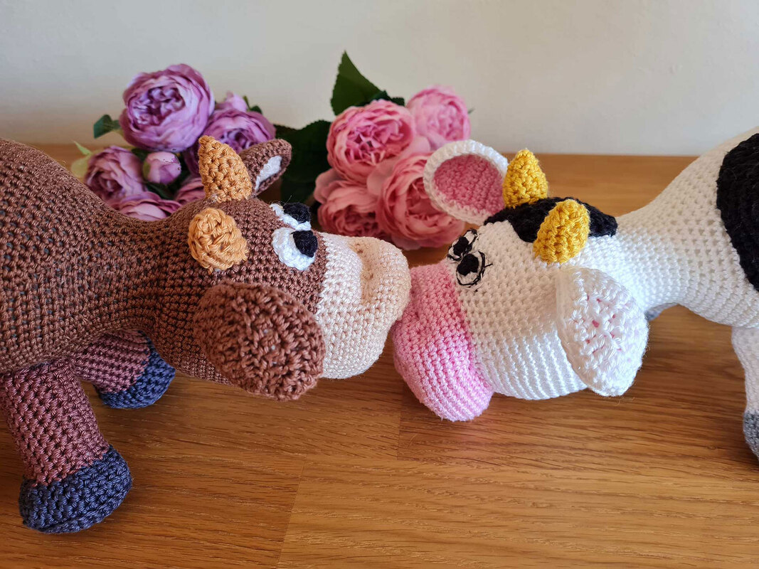 Die fertigen Kühe sind bei Garn mit 50g/125m ungefähr 23cm lang.