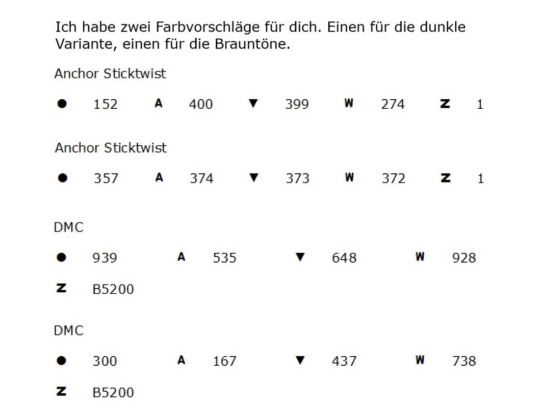 Garnvorschlag Anchor Sticktwist und DMC, 5 Farben,