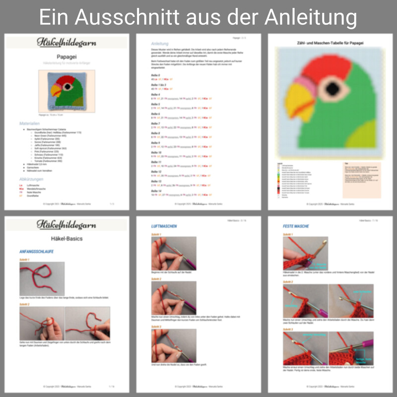 In der Anleitung wird keine Häkelschrift verwendet. Die Maschentabelle ist so gestaltet, dass das Häkeln durch fertig gezählte Maschen erleichtert und beschleunigt wird. Es wird in Reihen und festen Maschen gehäkelt.